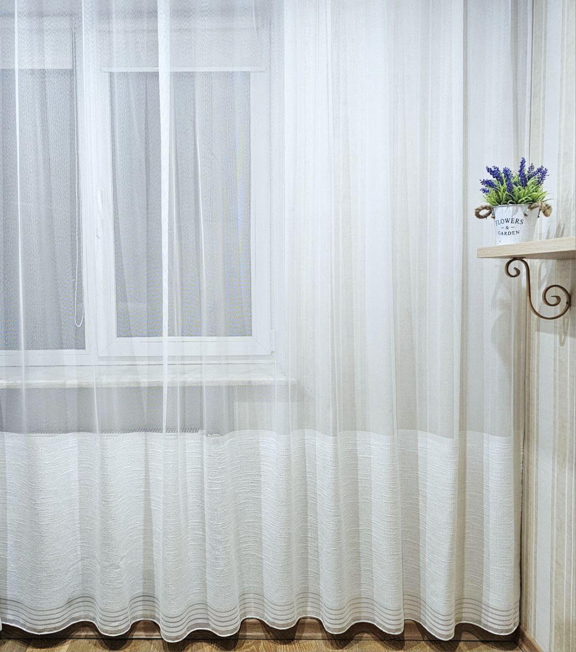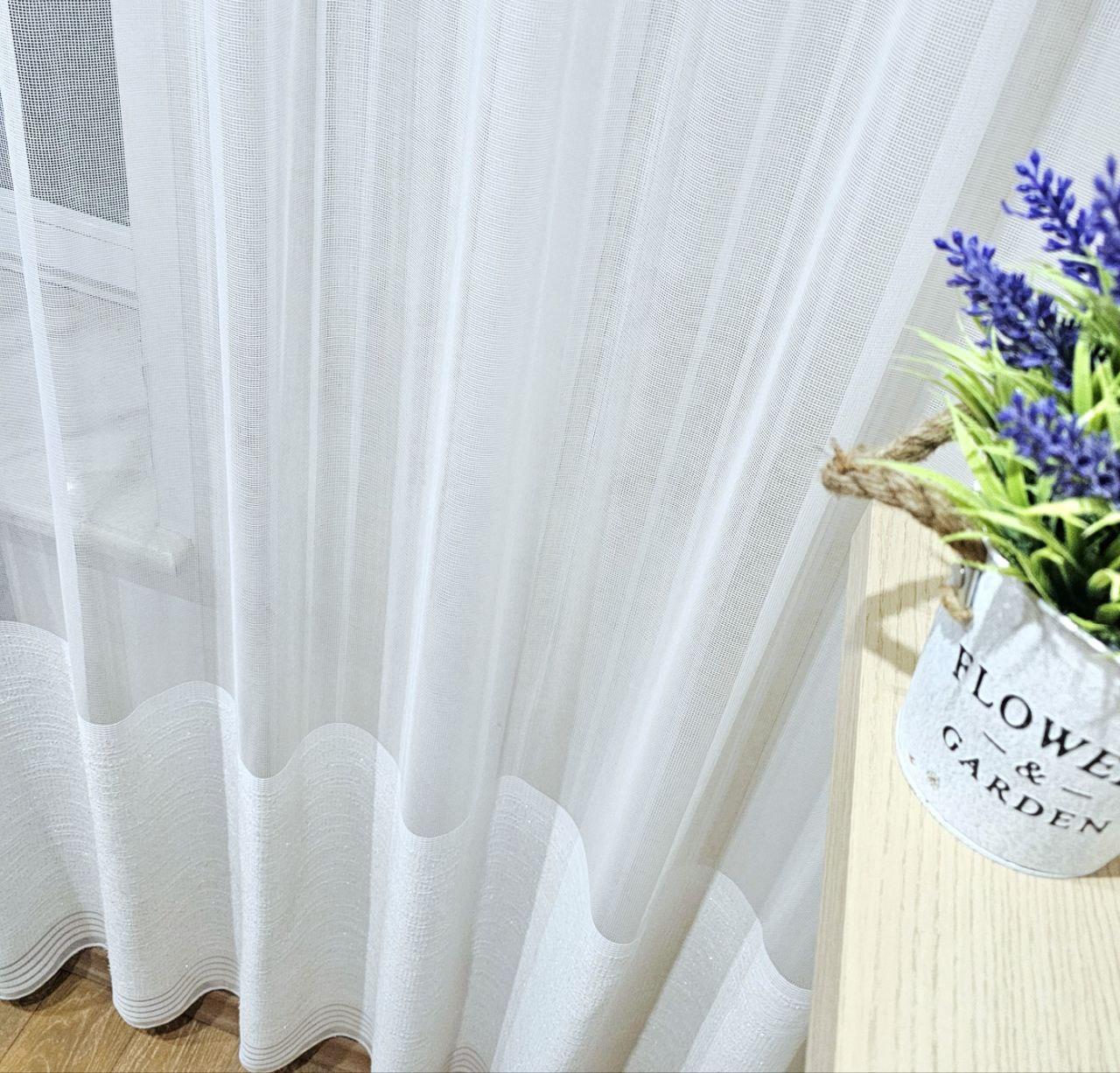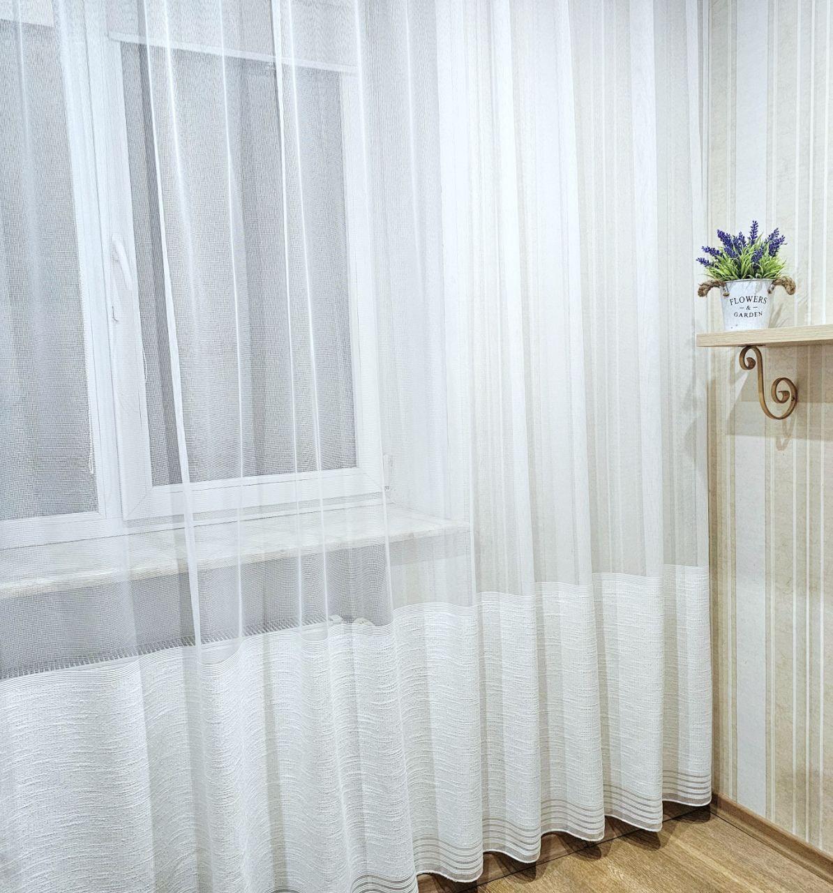 Або замовити пошиття готового тюля. До послуги входить: пошиття тасьми з петельками під гачки (тасьма на карниз трубу або люверси), обробка всіх країв після відрізу від рулону, пошиття на індивідуальну висоту.