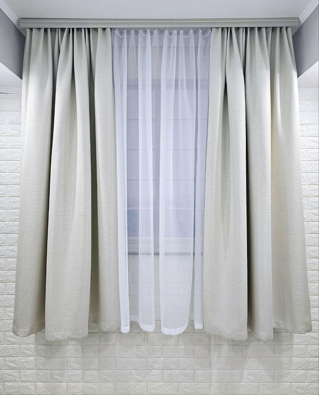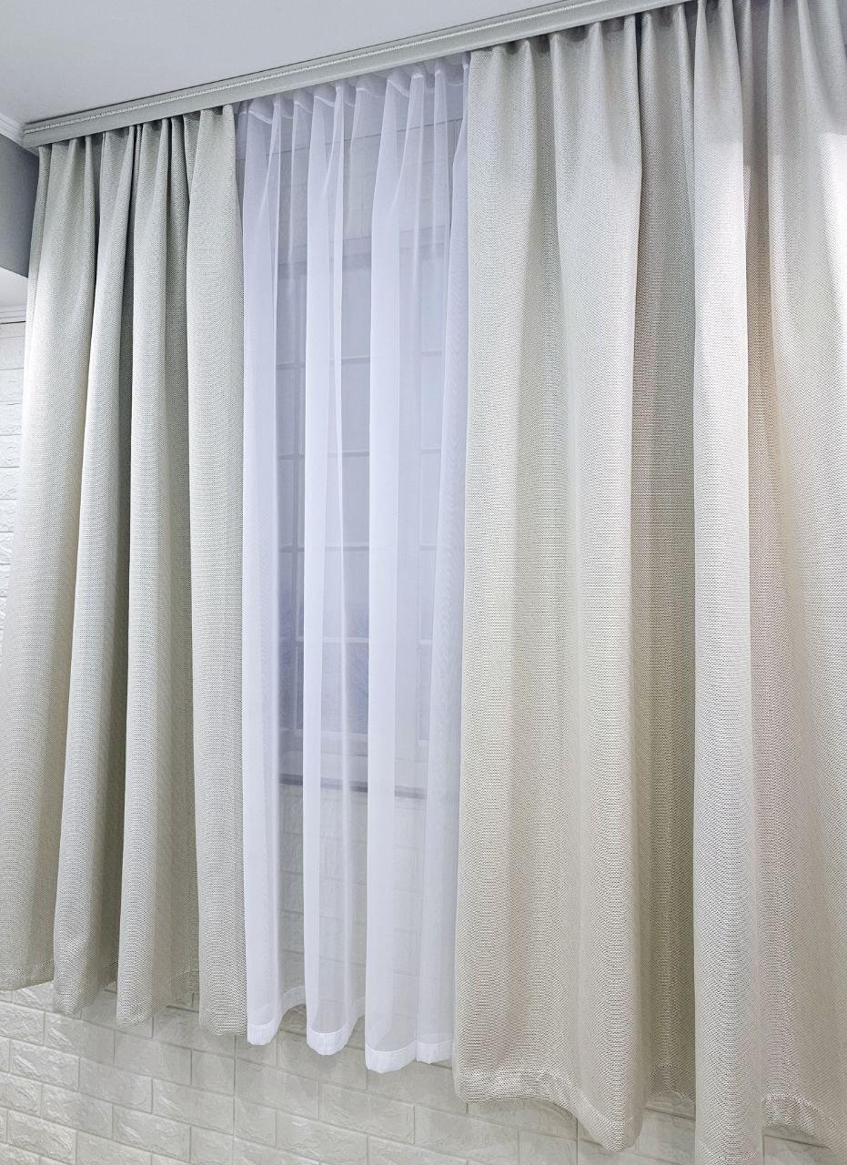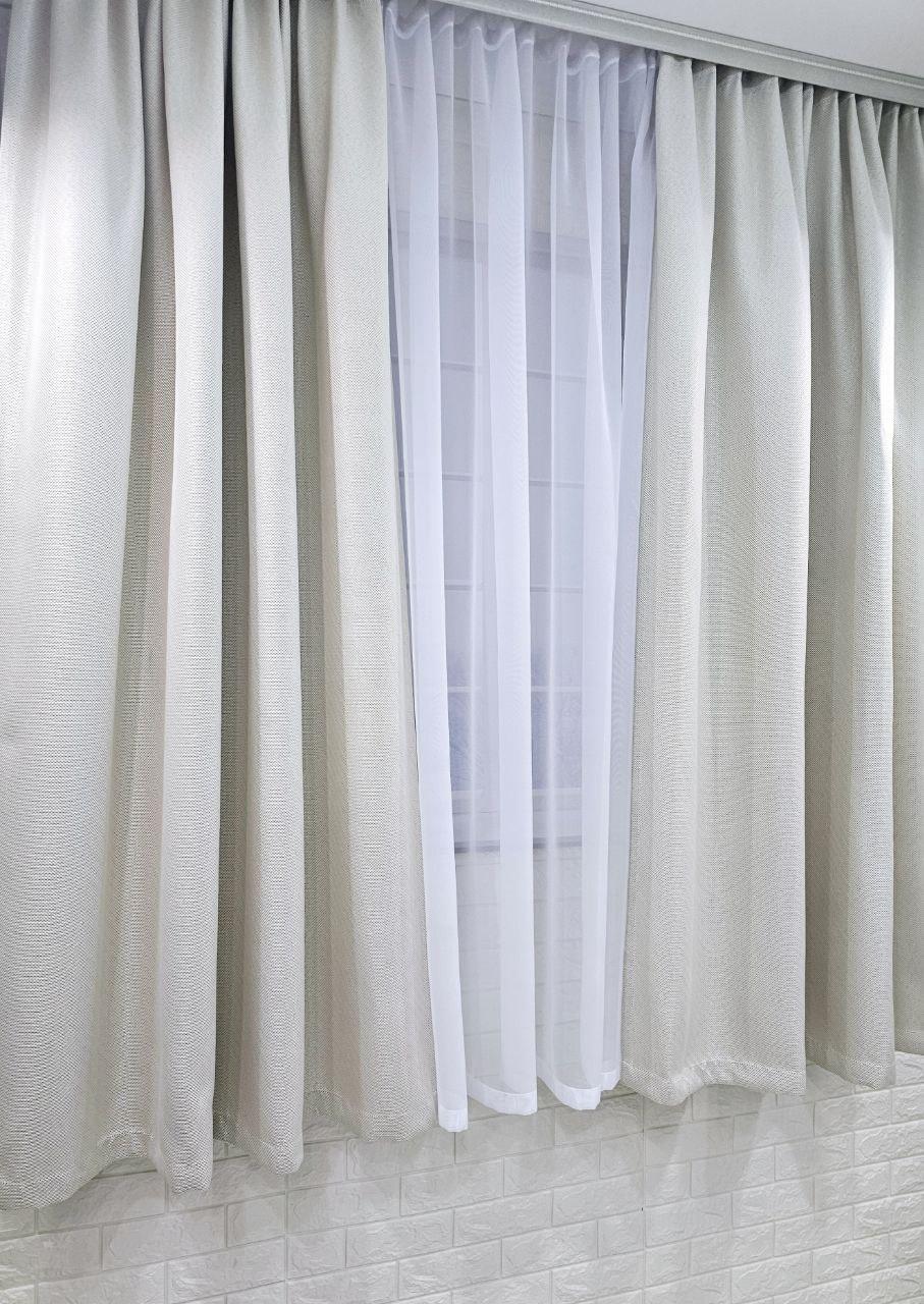 Комплект короткі штори і тюль. Блекаут льон рогожка + тюль шифон. Колір: світлий бежевий штори, білий тюль