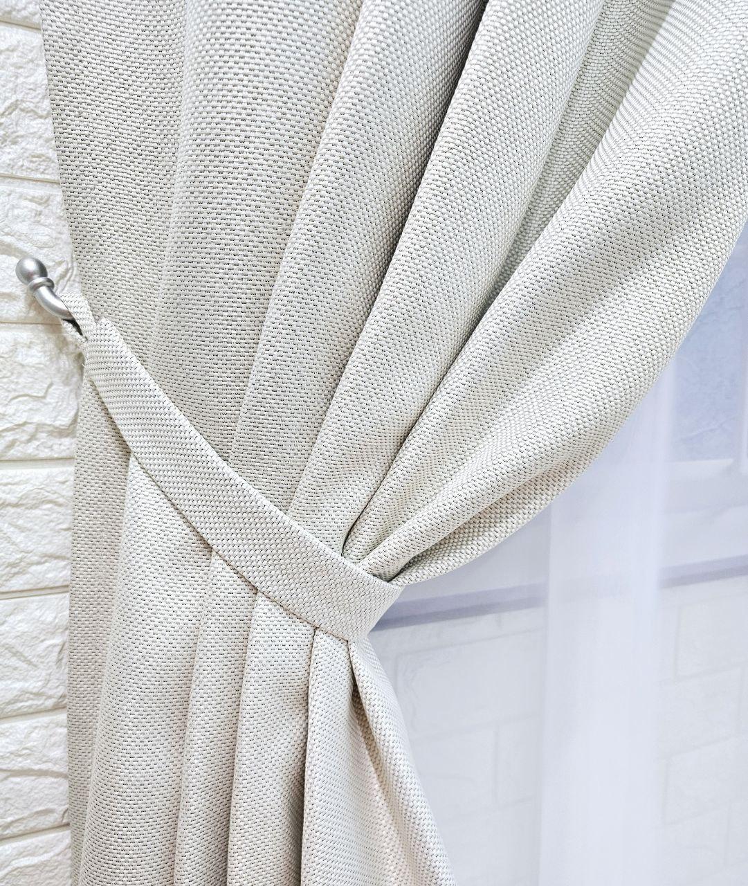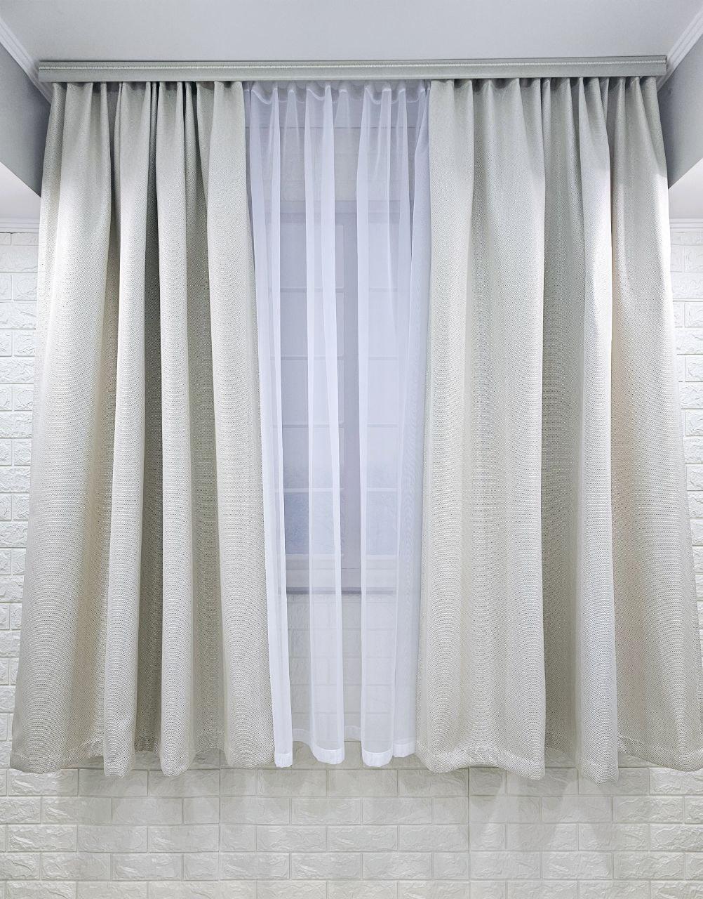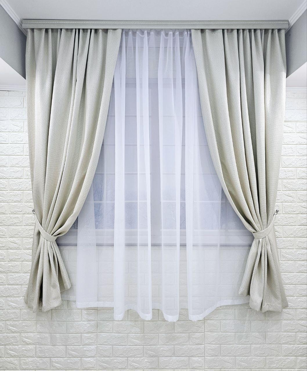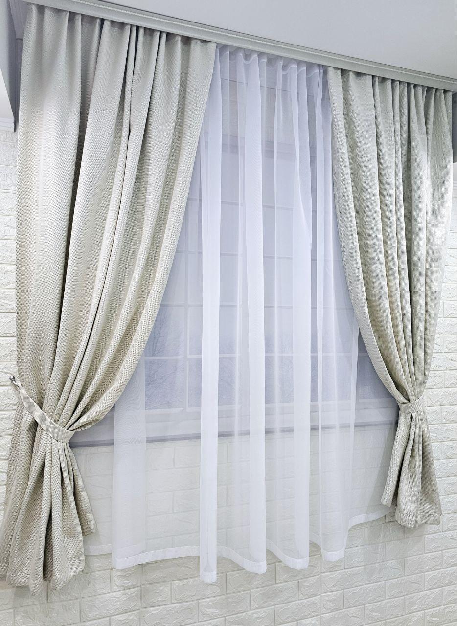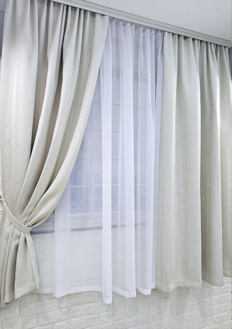 Комплект короткі штори і тюль. Блекаут льон рогожка + тюль шифон. Колір: світлий бежевий штори, білий тюль