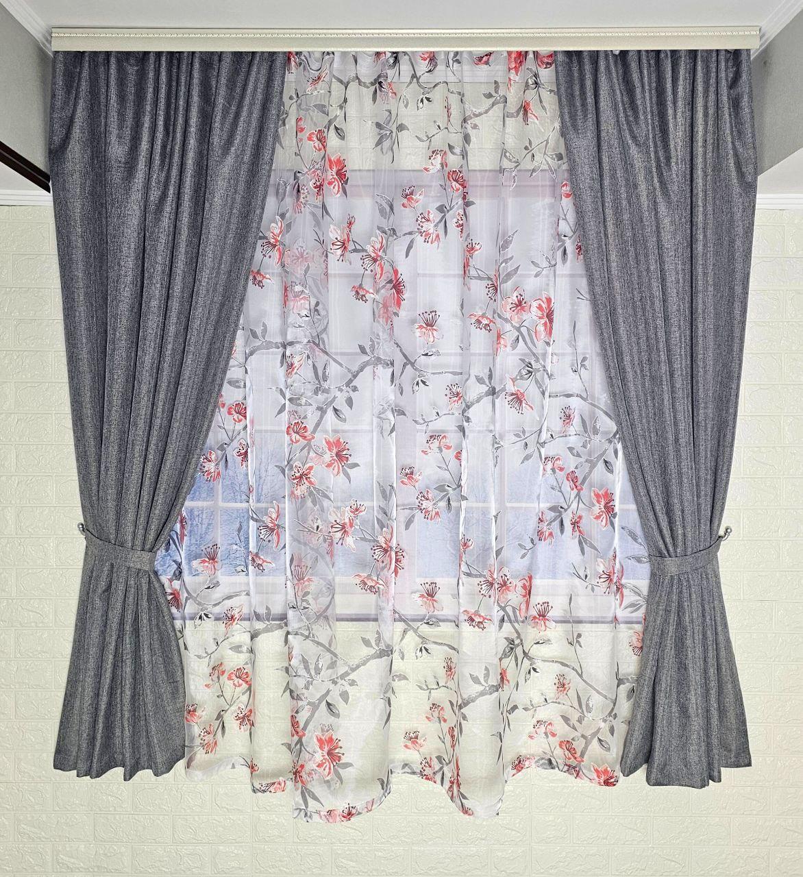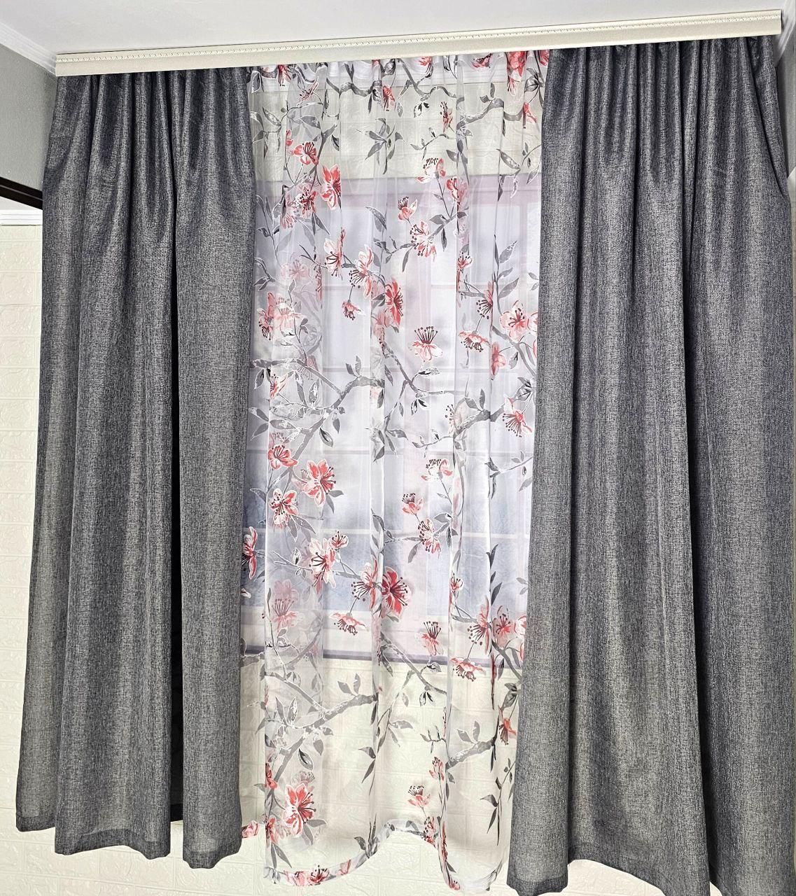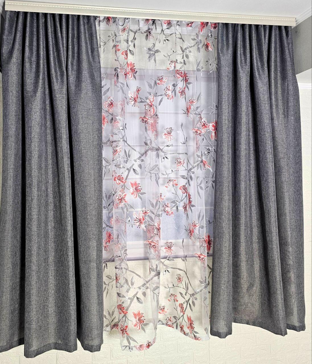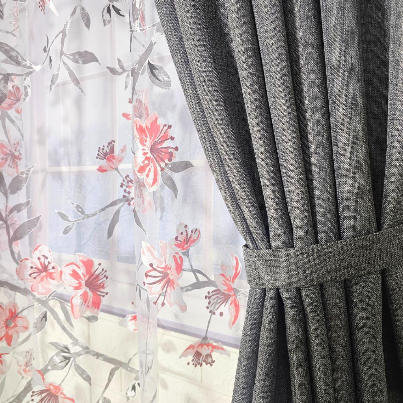 Колір: сірі штори + тюль з квітковим принтом.