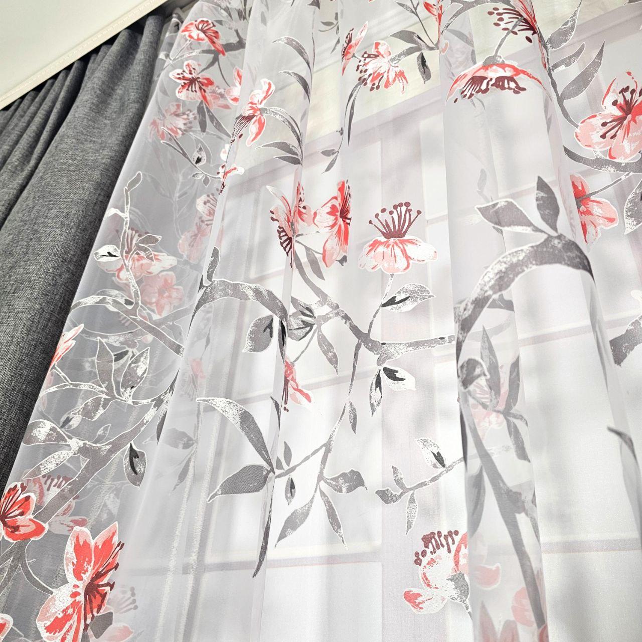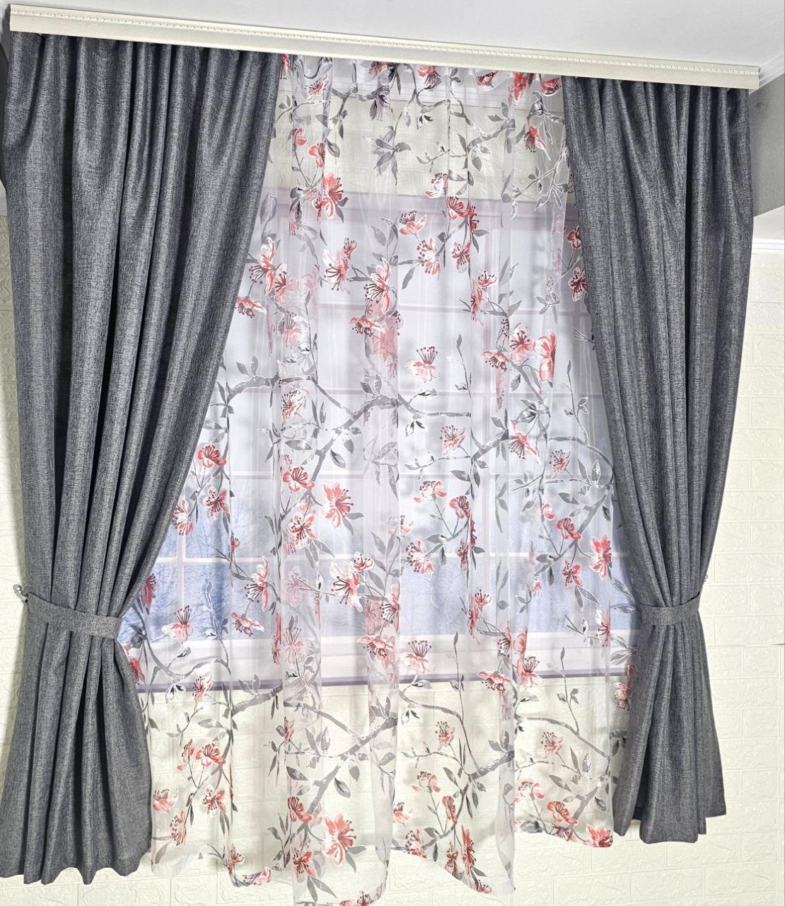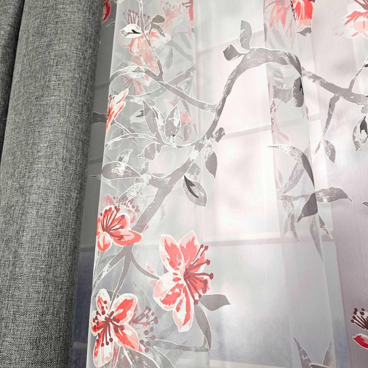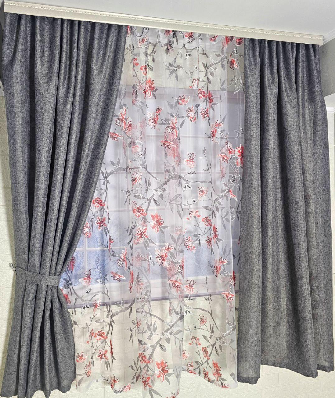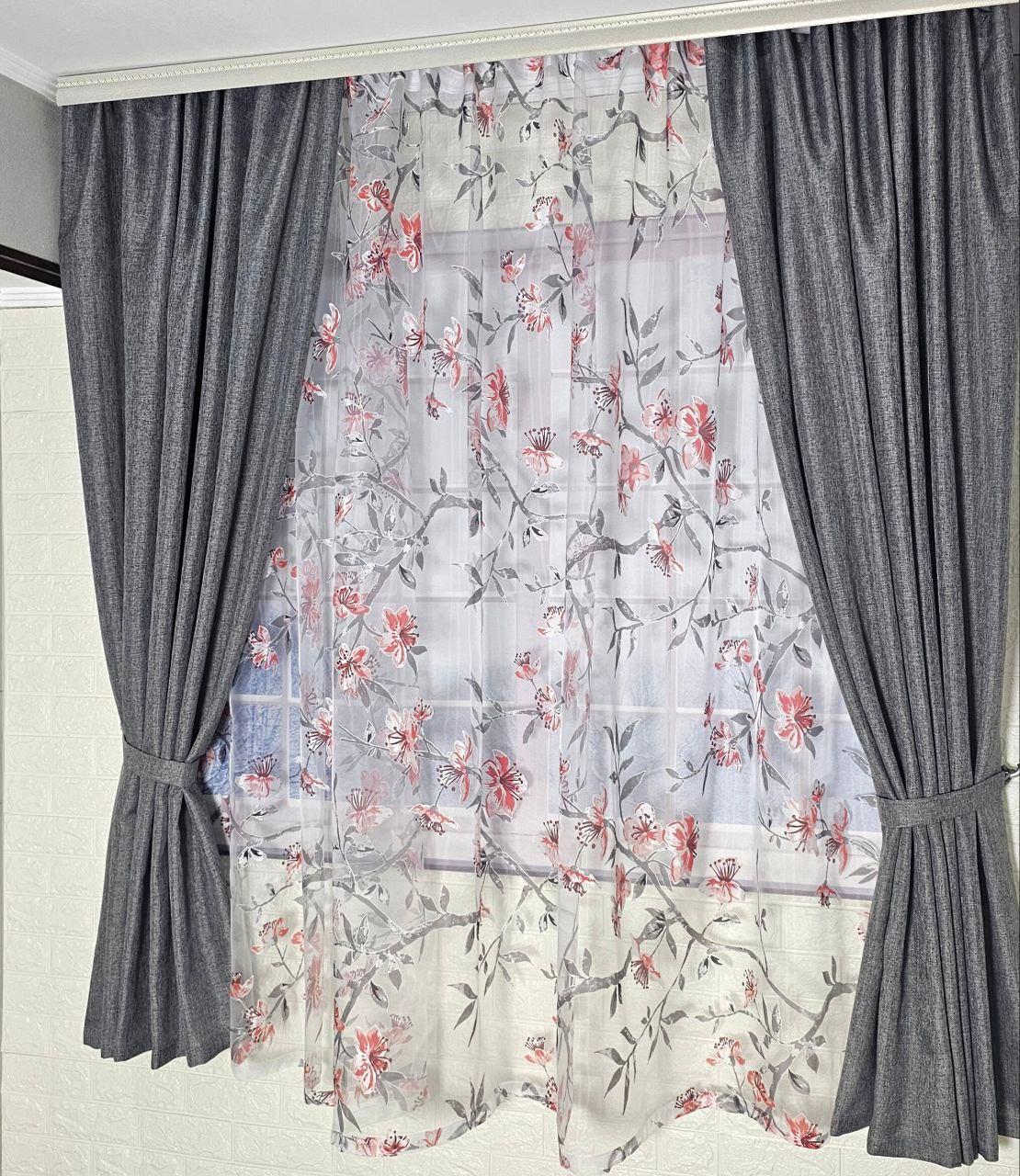 Колір: сірі штори + тюль з квітковим принтом.