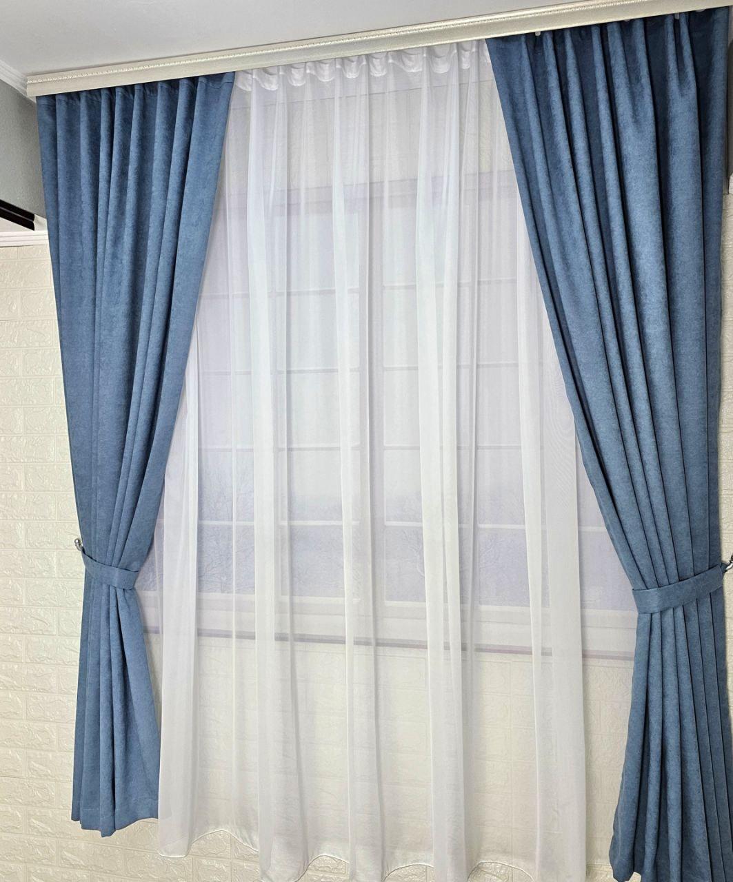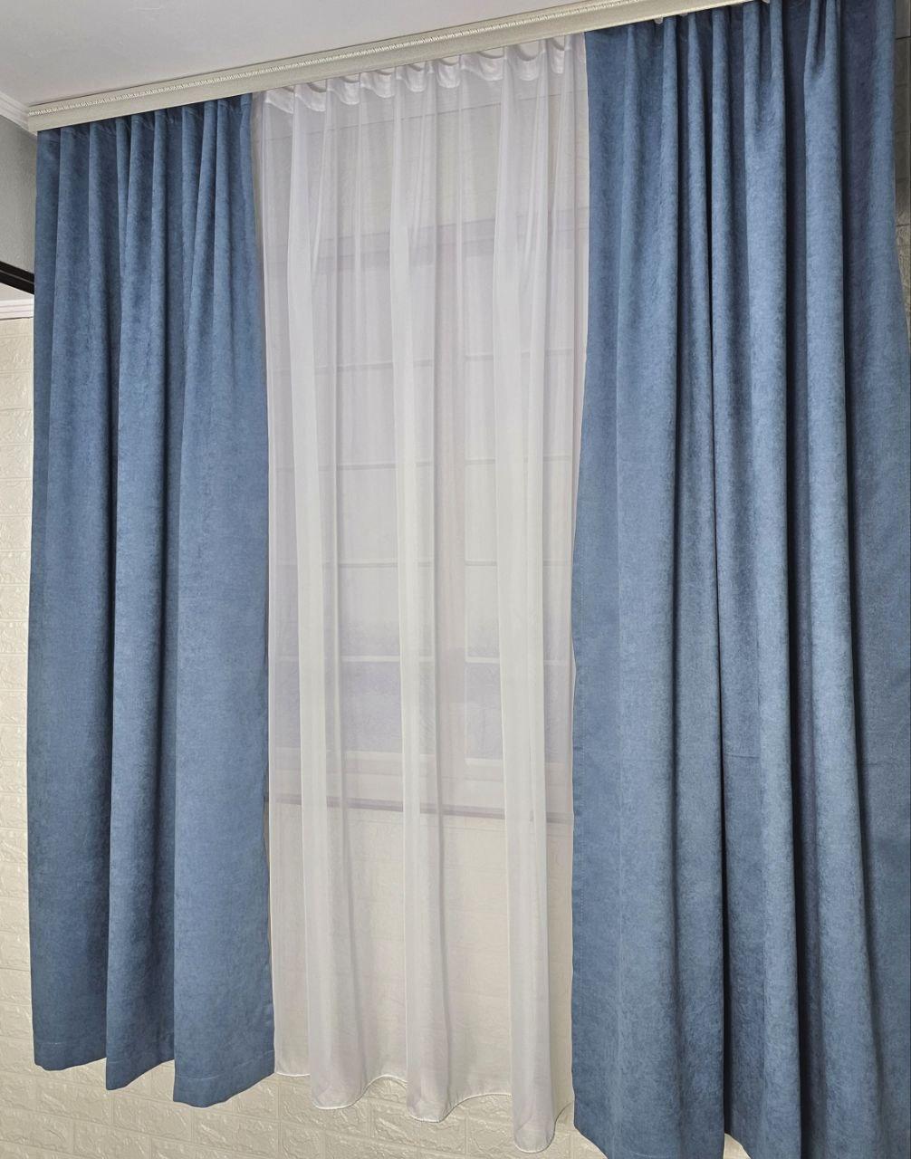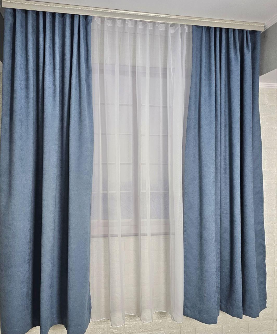 Комплект короткі штори і тюль. Мікровелюр + тюль шифон вуаль. Колір: сіро-блакитний штори, білий тюль