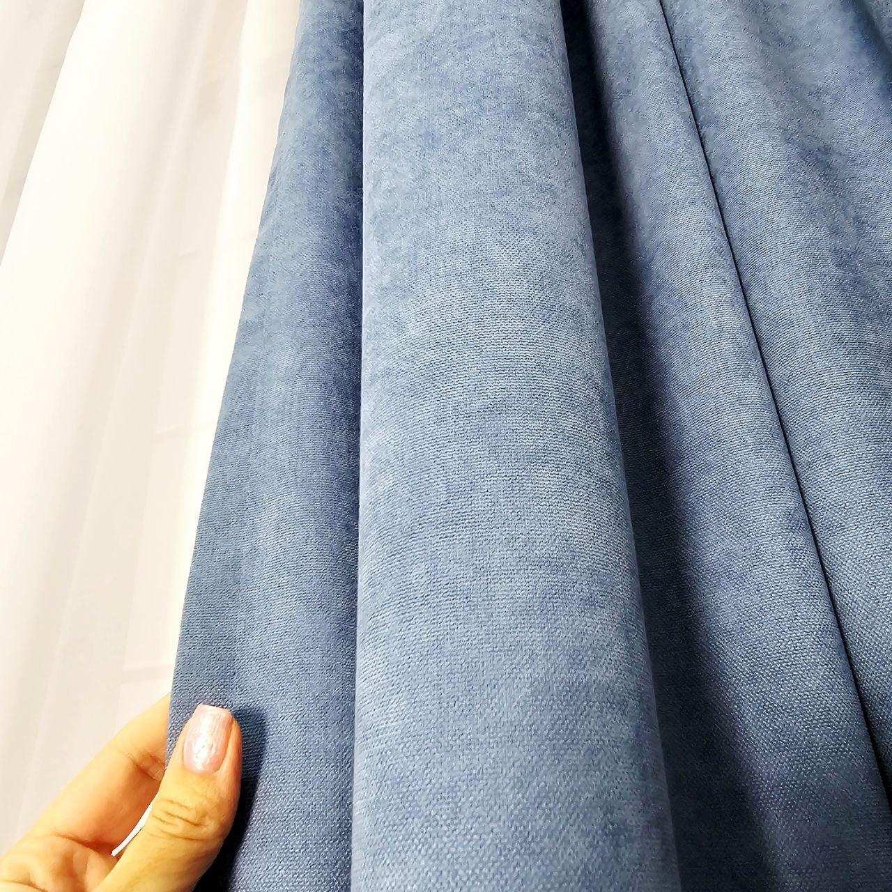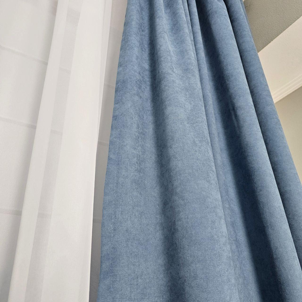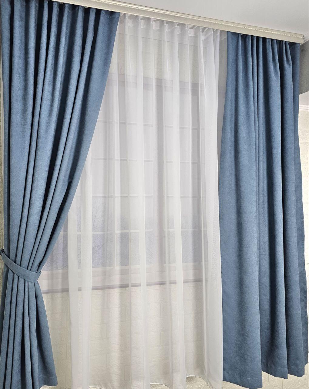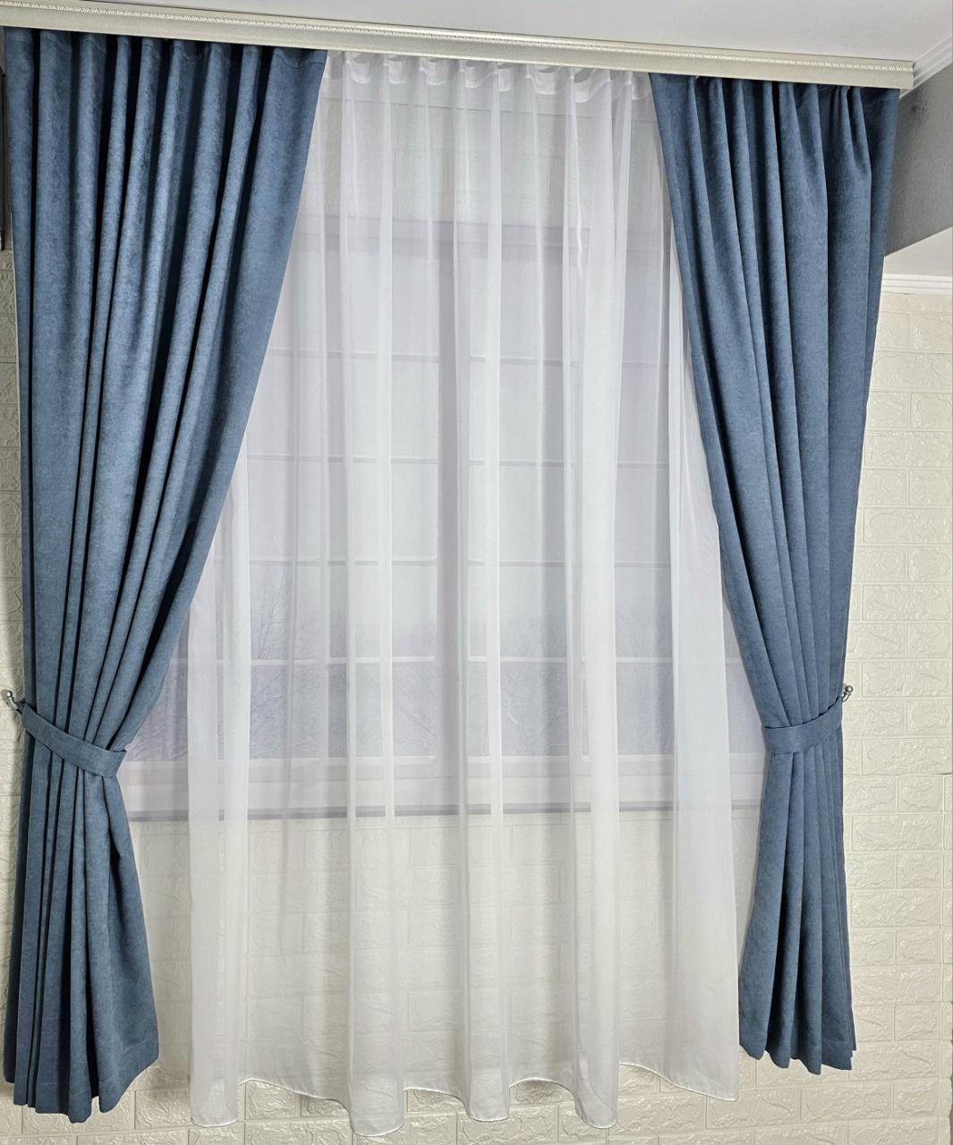Комплект короткі штори і тюль. Мікровелюр + тюль шифон вуаль. Колір: сіро-блакитний штори, білий тюль