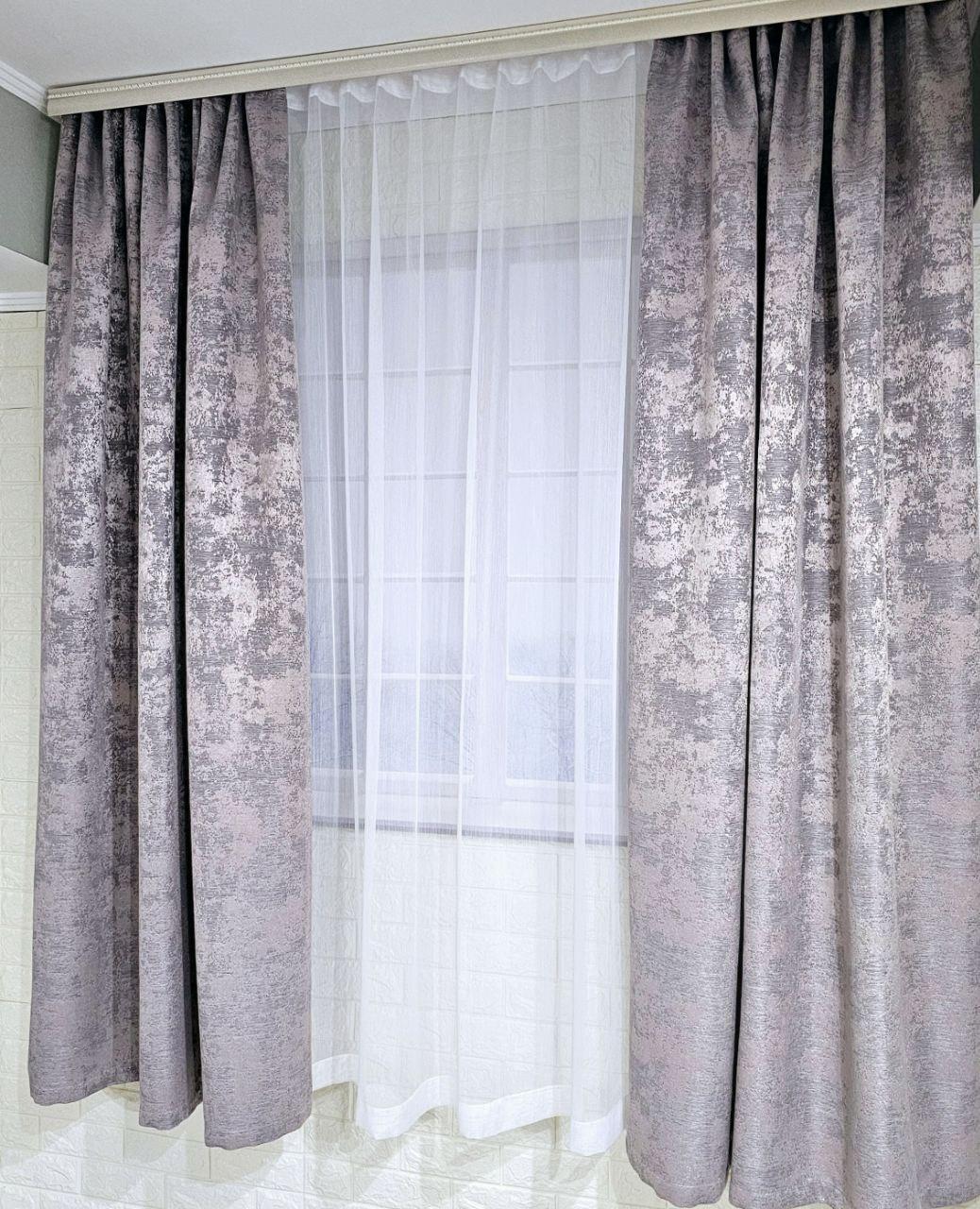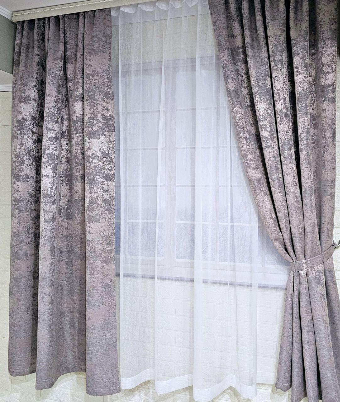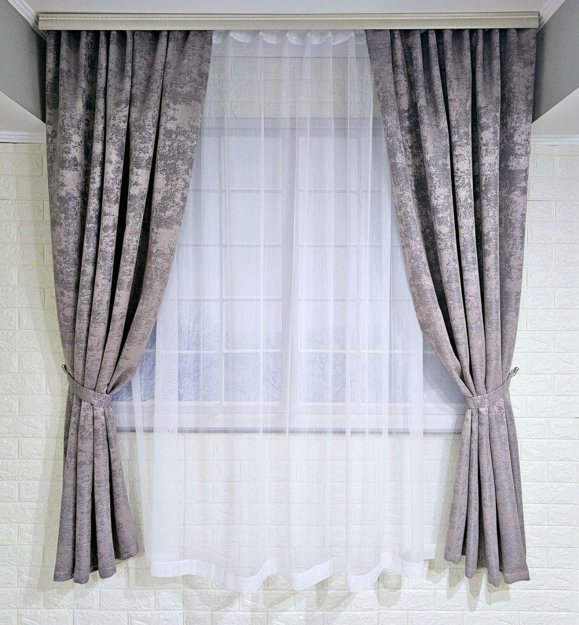 Комплект короткі штори і тюль. Жаккард маармур + тюль льон. Колір: сірий з темною пудрою штори, білий тюль