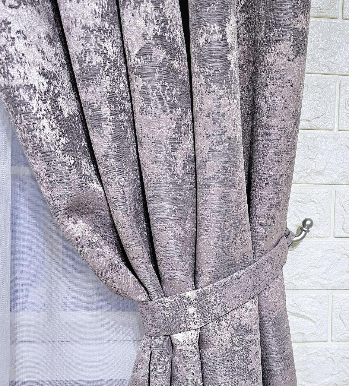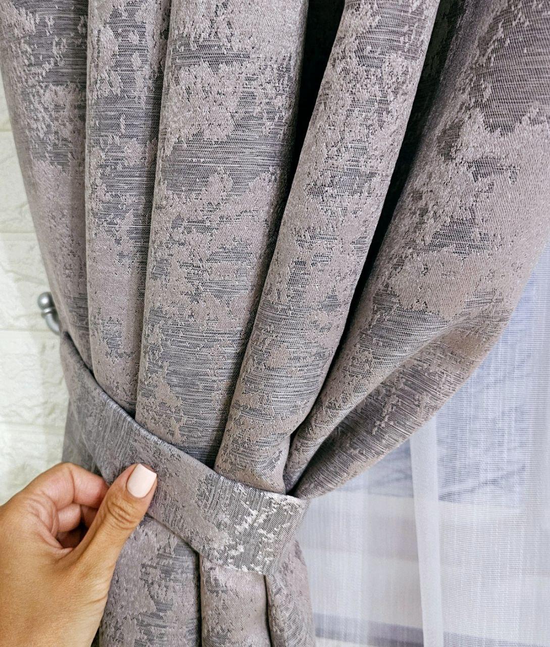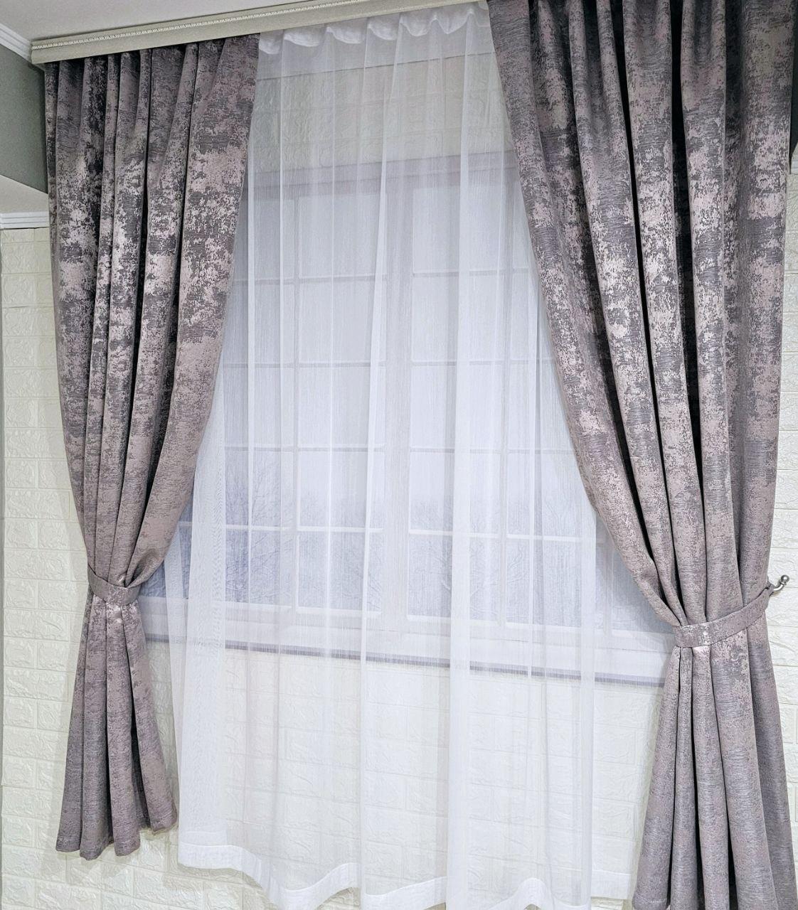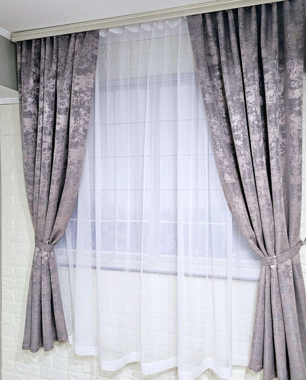 Комплект короткі штори і тюль. Жаккард маармур + тюль льон. Колір: сірий з темною пудрою штори, білий тюль