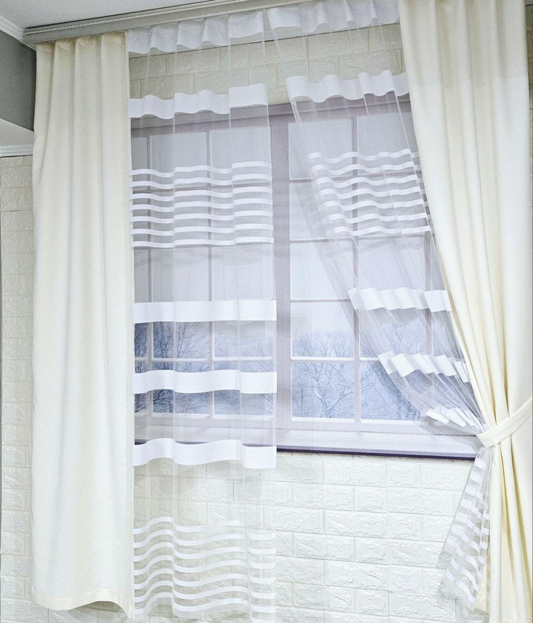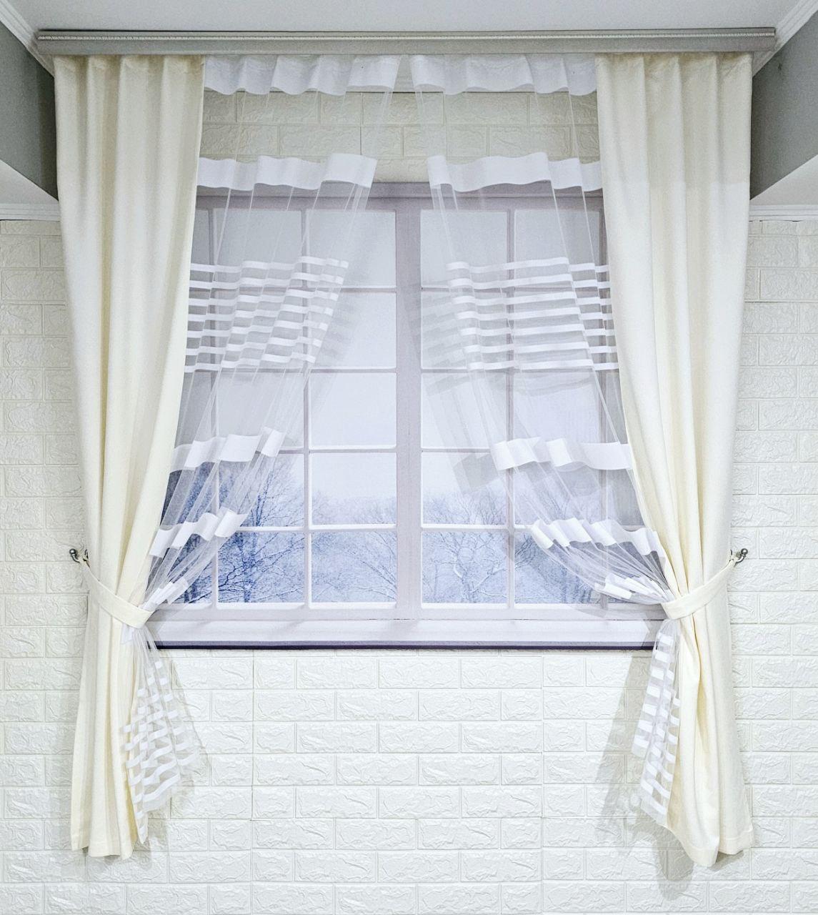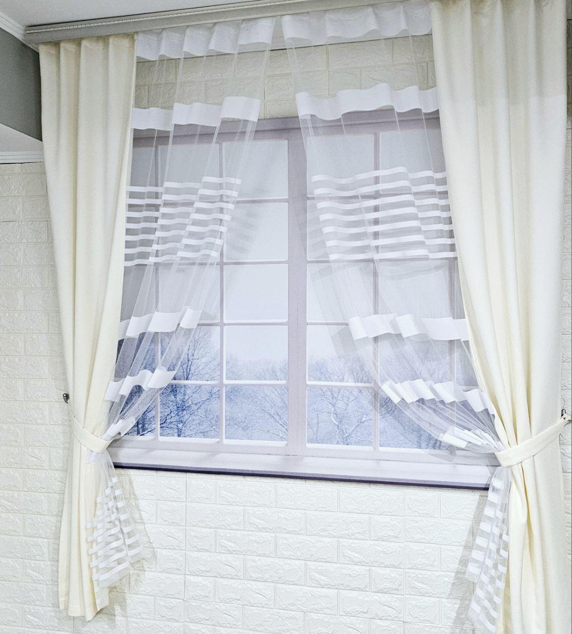 Комплект короткі штори тюль. Колір молочний з білим