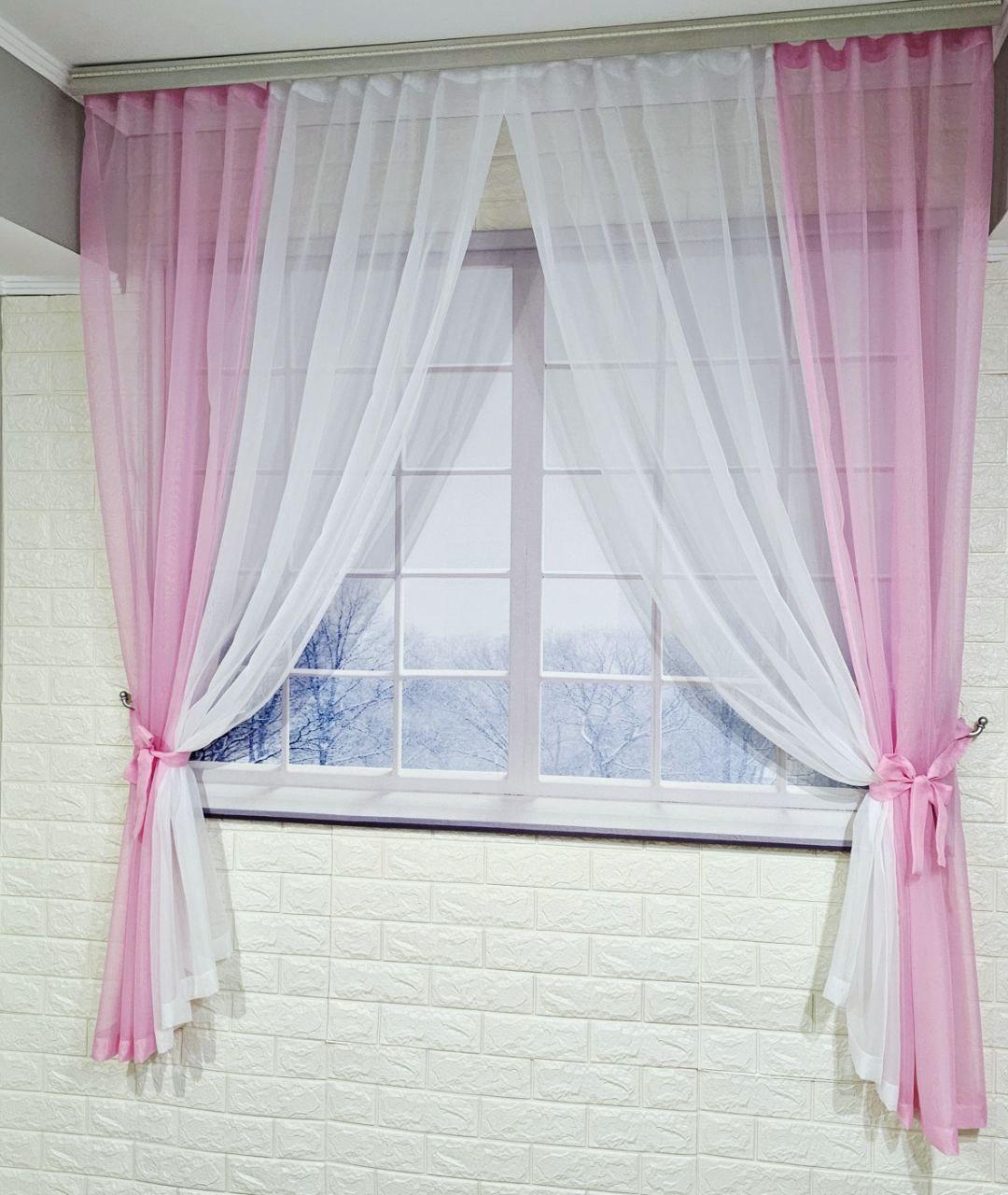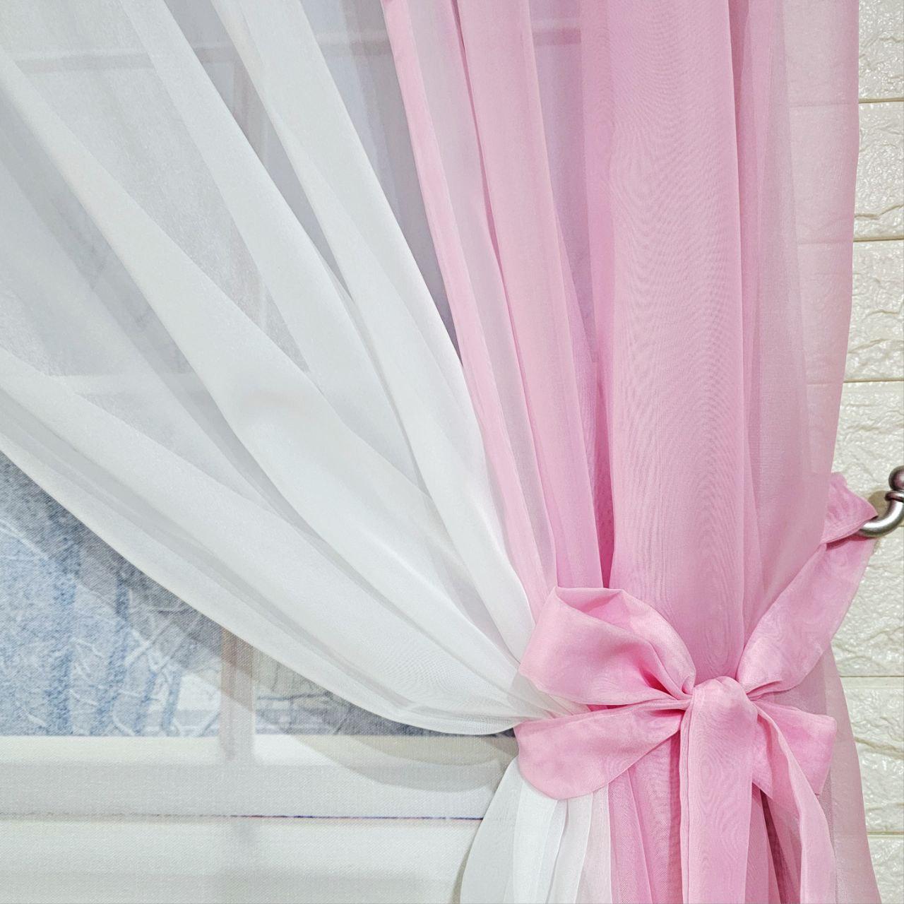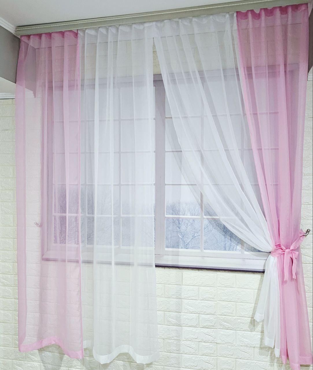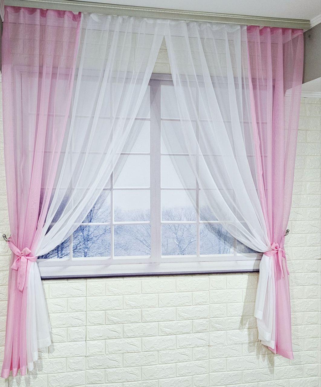 Комплект короткий тюль з зав’язками. Колір рожевий з білим