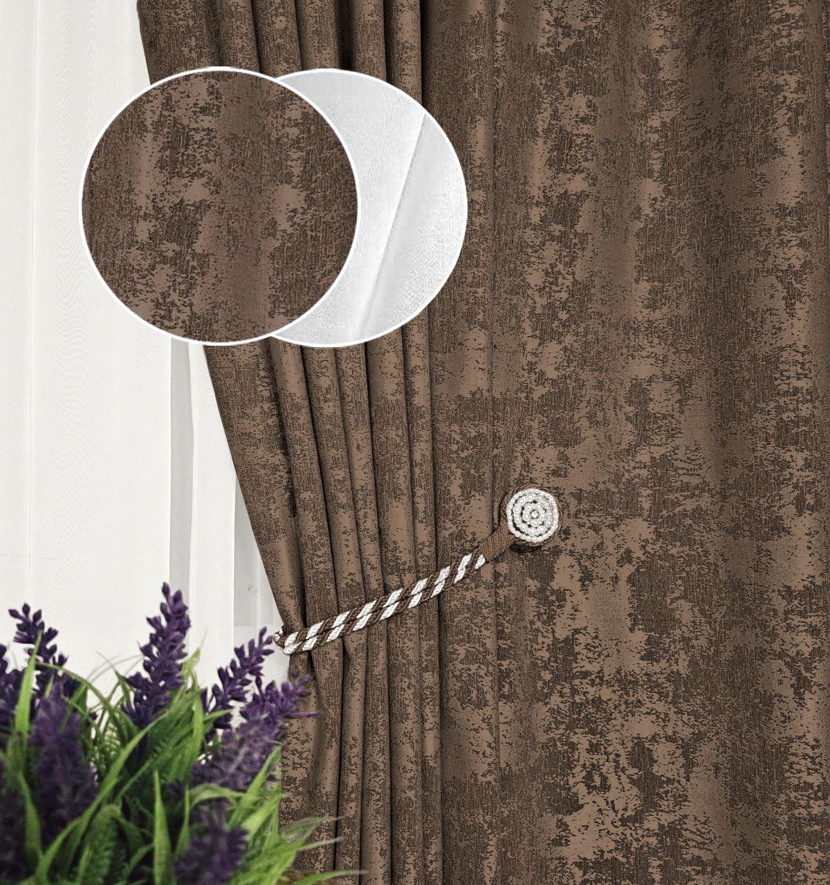 Комплект штори і тюль. Тканина жаккард мармур + шифон. Колір: коричневі штори, білий тюль
