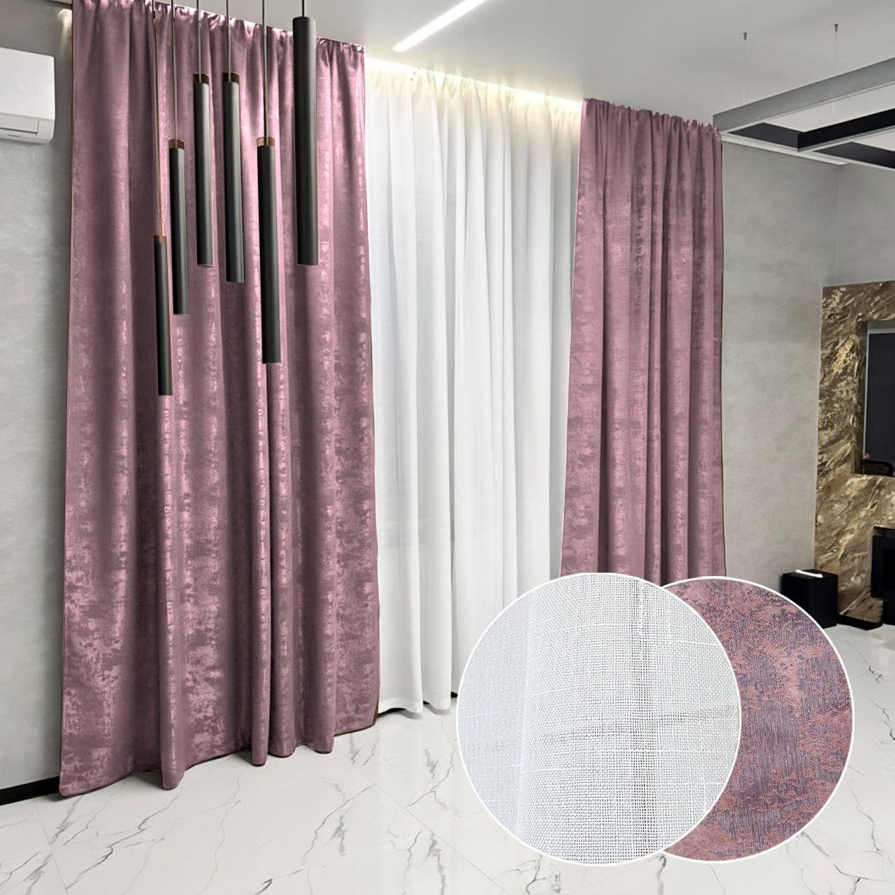 Комплект штори і тюль. Тканина жаккард мармур + льон. Колір: пильна троянда штори, білий тюль