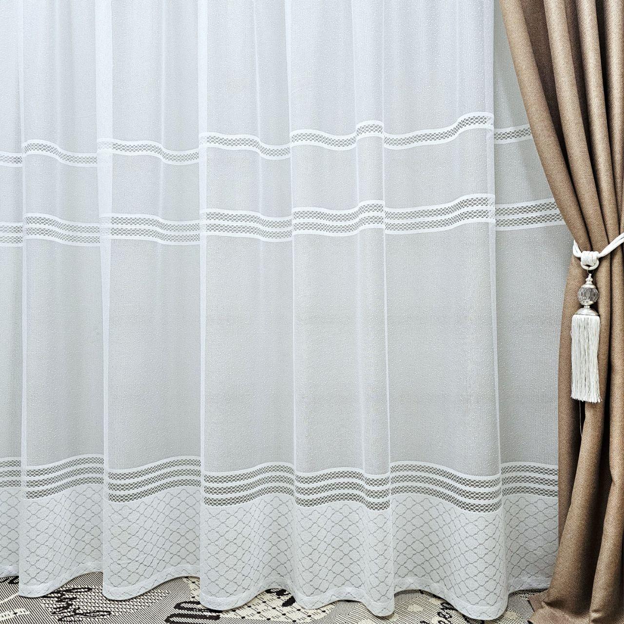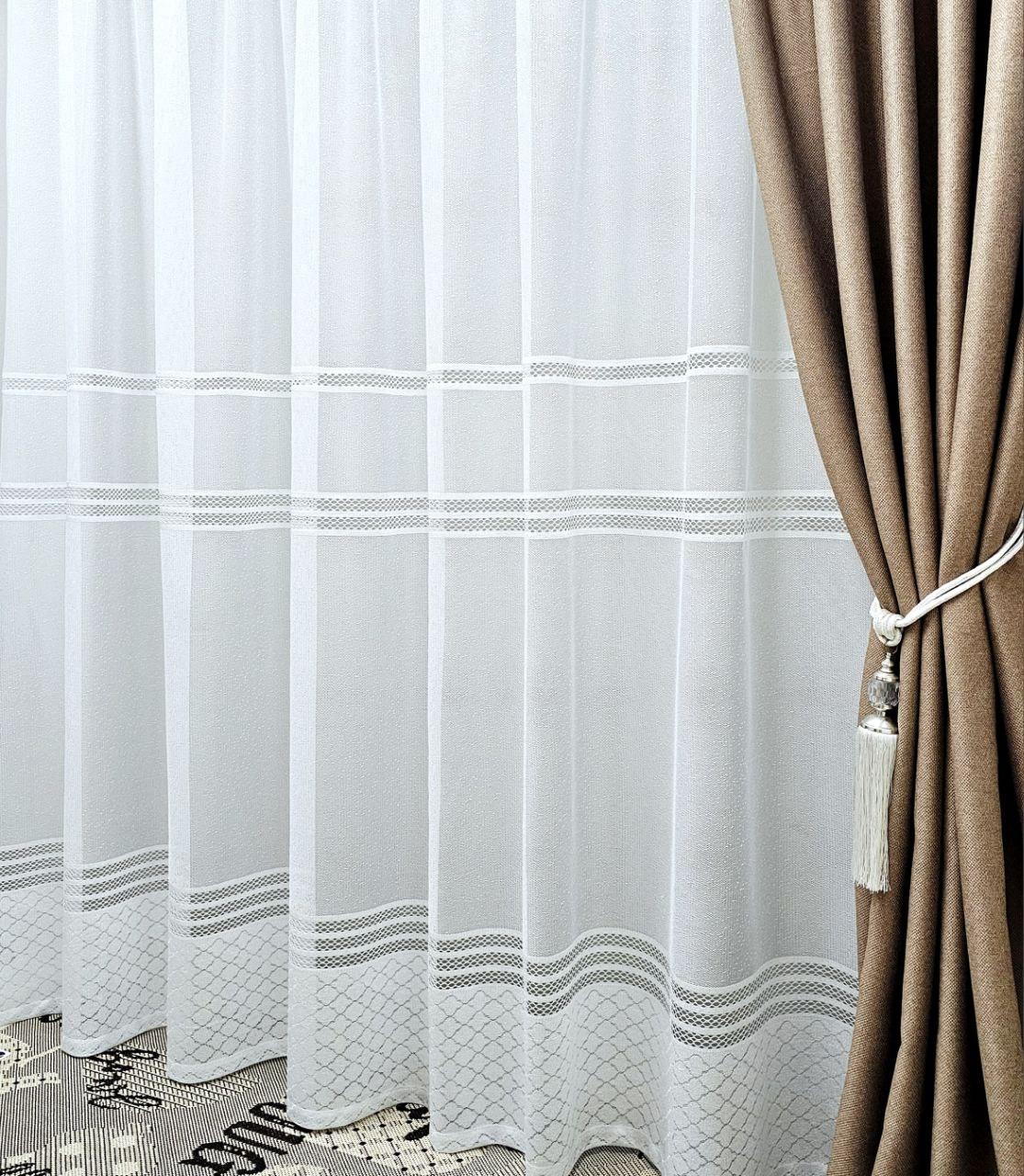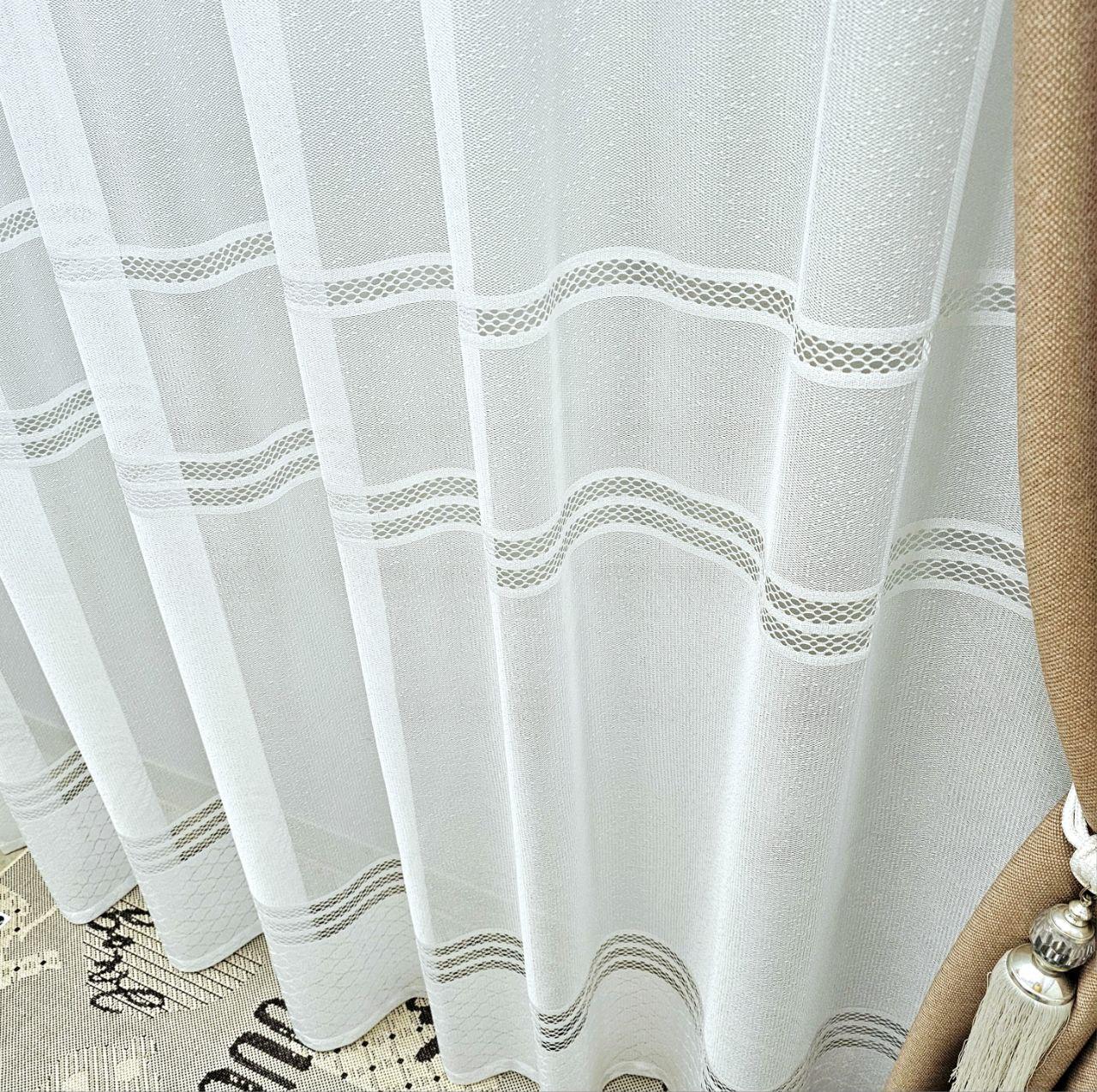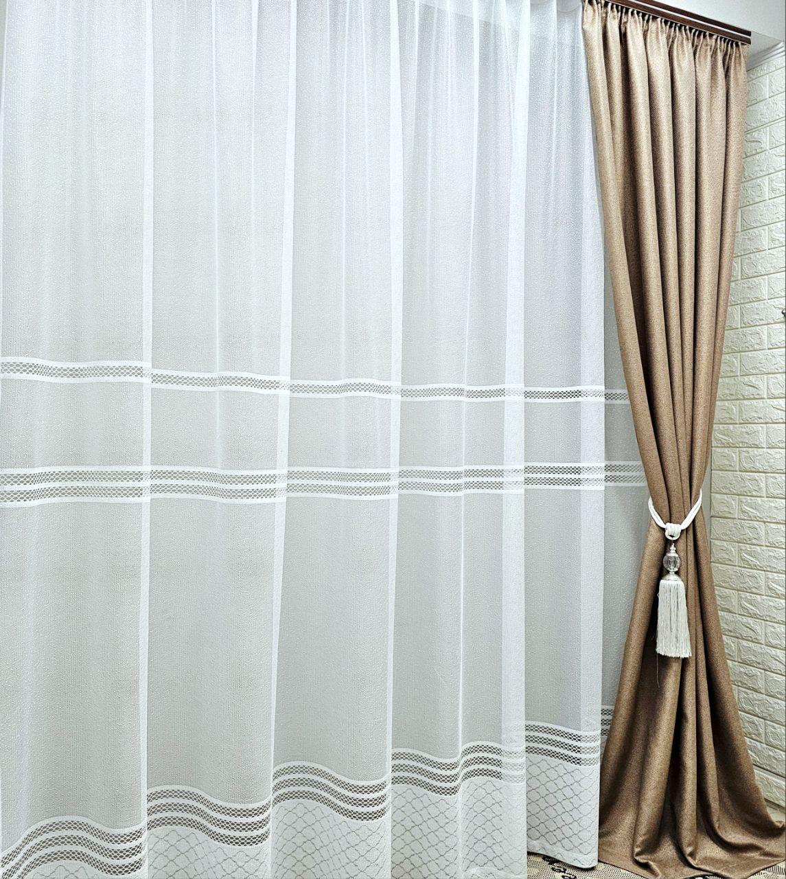 Або замовити пошиття готового тюля. До послуги входить: пошиття тасьми з петельками під гачки (тасьма на карниз трубу або люверси), обробка всіх країв після відрізу від рулону, пошиття на індивідуальну висоту.