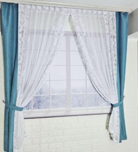 Комплект короткие шторы тюль. Цвет бирюзовый с белым Ширина каждой шторы: 1,2м. Ширина регулируется по тесьме. Высота: 1,8м Способ крепления: пришита тесьма с петельками под любой вид крючков. Ткань: лен мешковина + тюлевый лен. Цвет: бирюзовый с белым Интернет магазин предлагает большой выбор штор и тюлей по низкой цене. тел. (098) 808 92 41
