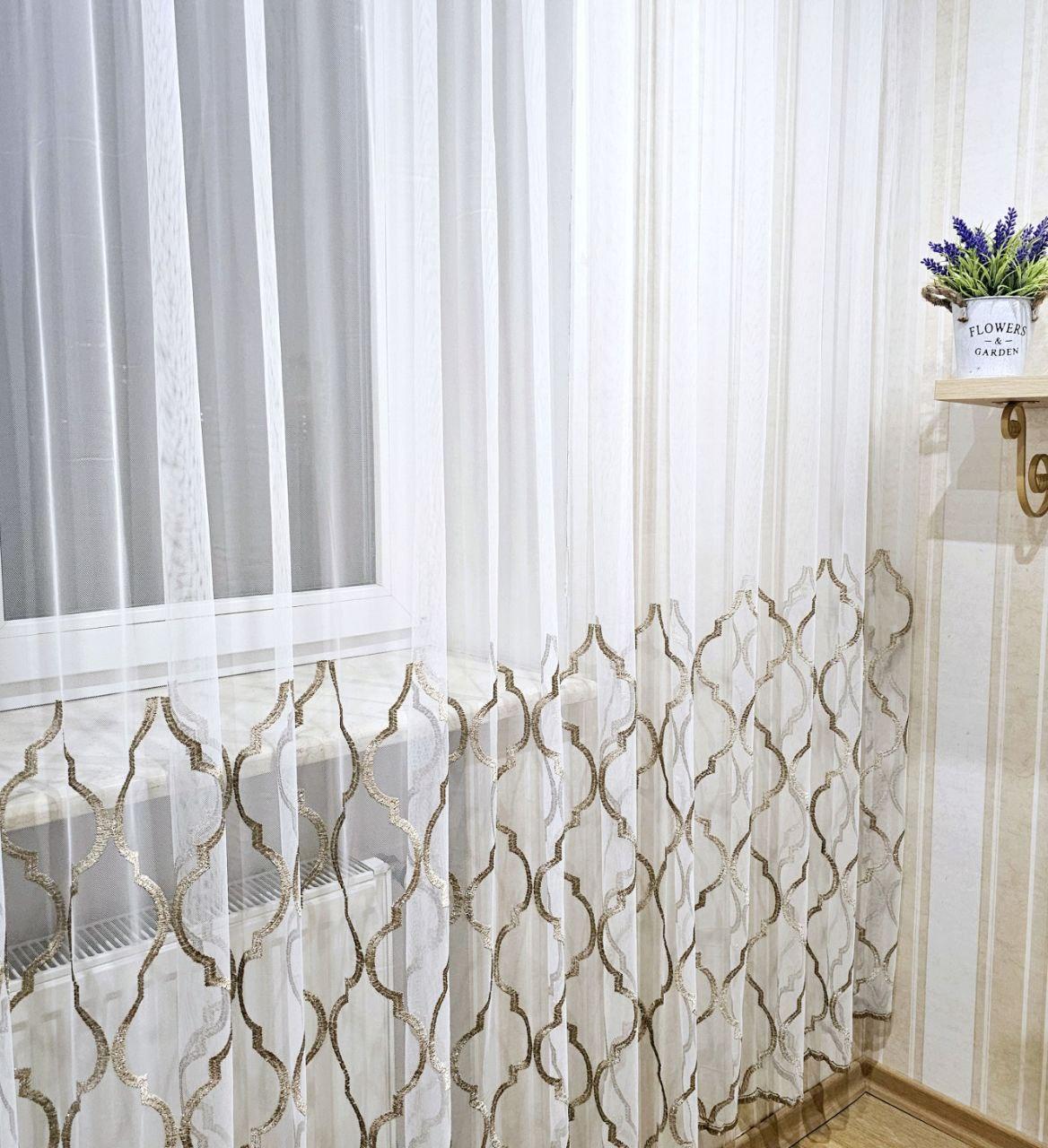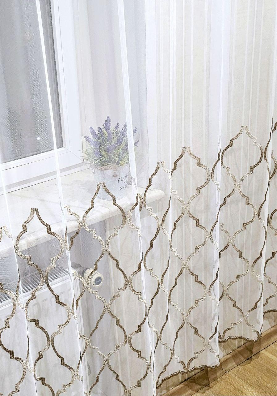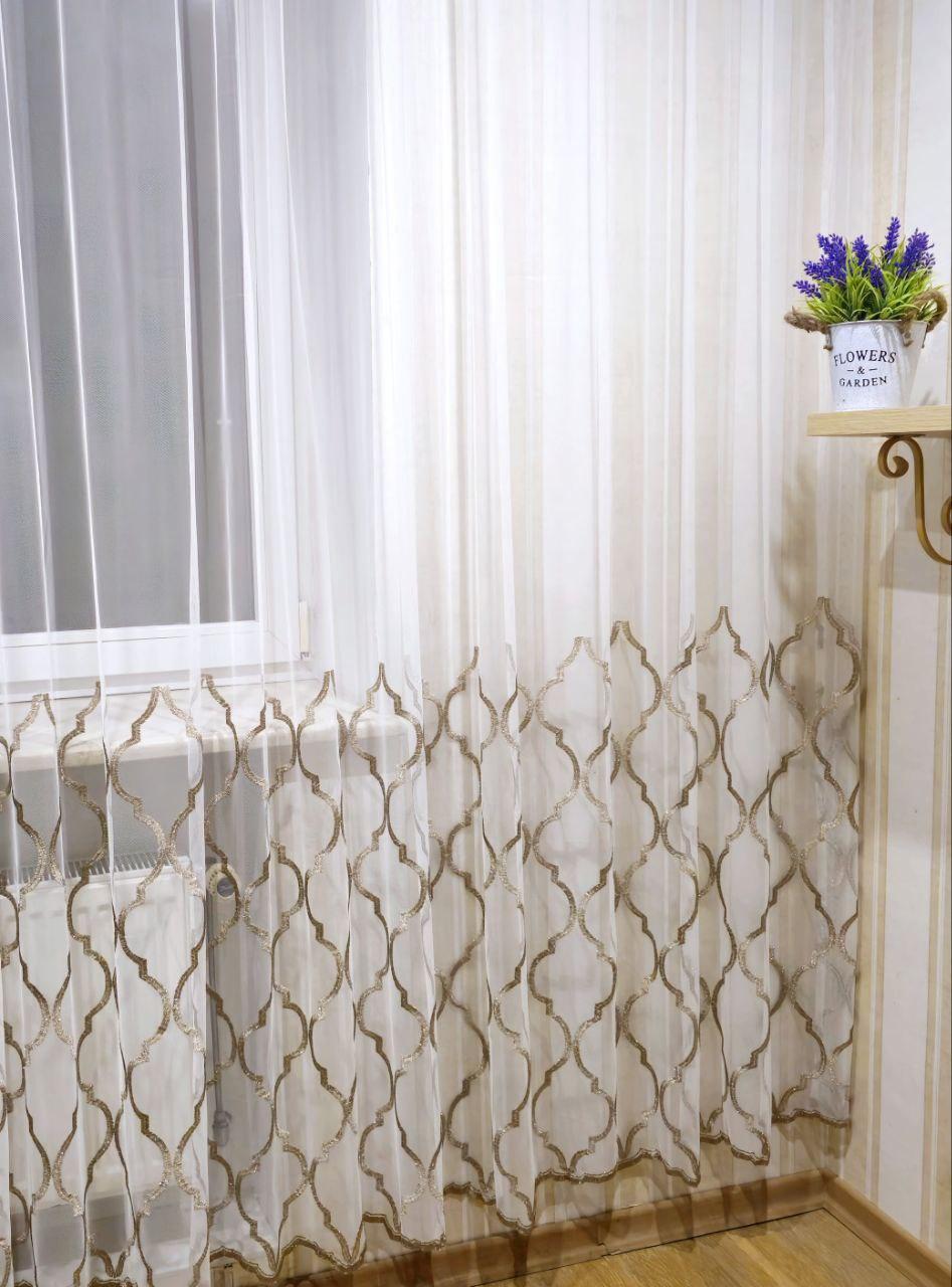 Белый тюль грек сетка с бежевой вышивкой по низу