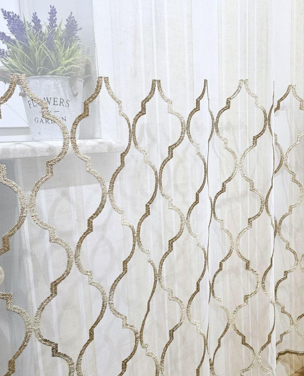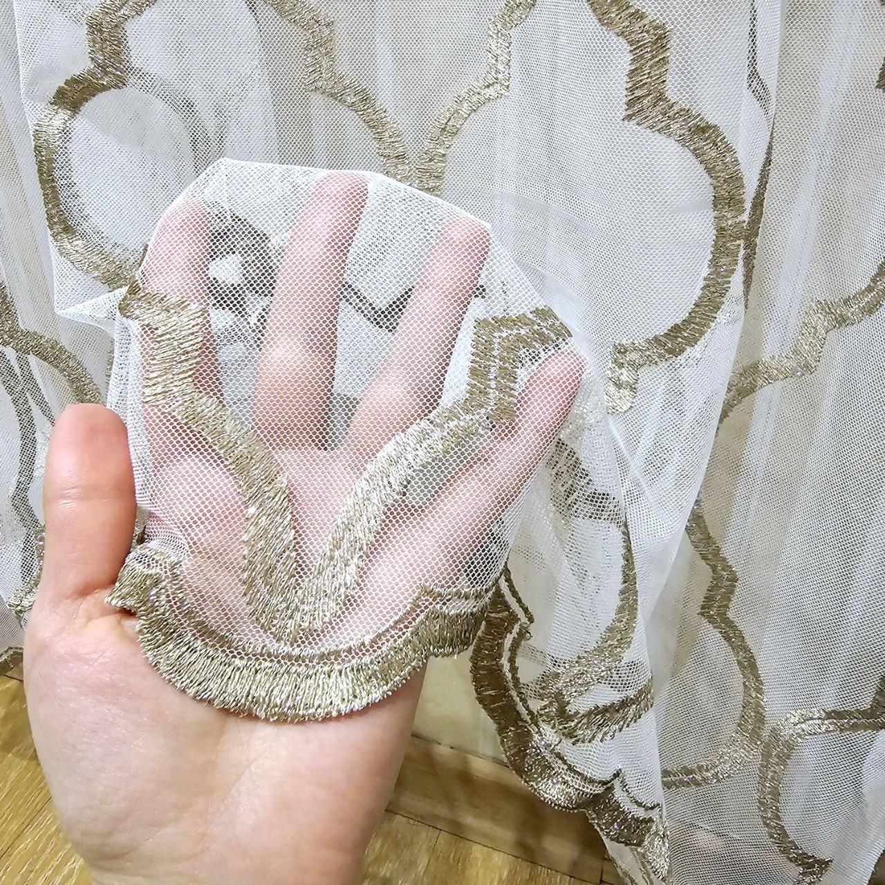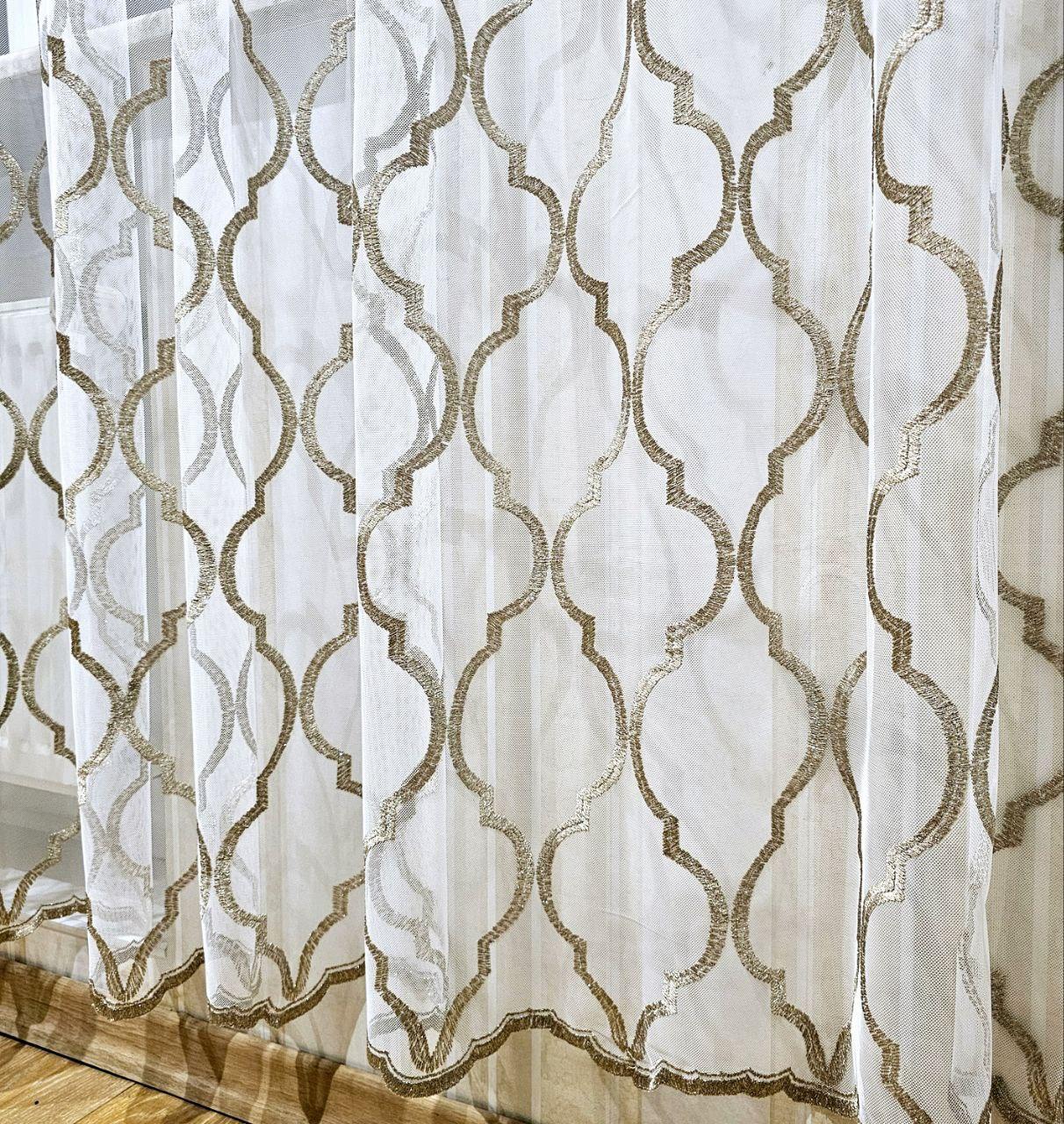 Белый тюль грек сетка с бежевой вышивкой по низу