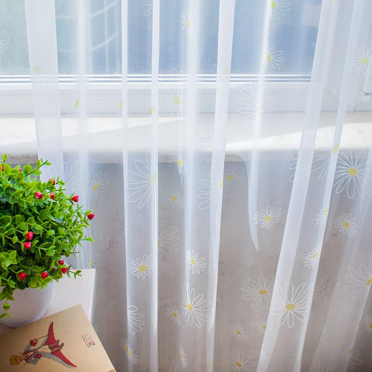 Готовый тюль органза, цвет белый с принтом Ромашки (4м*2,5м)