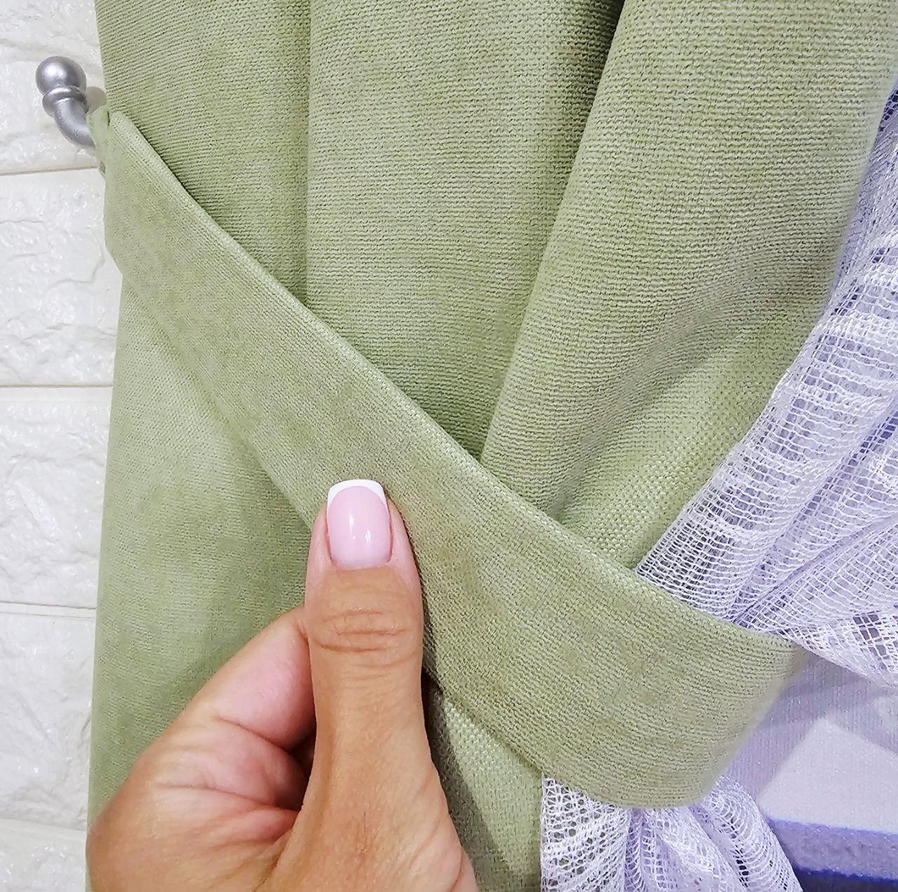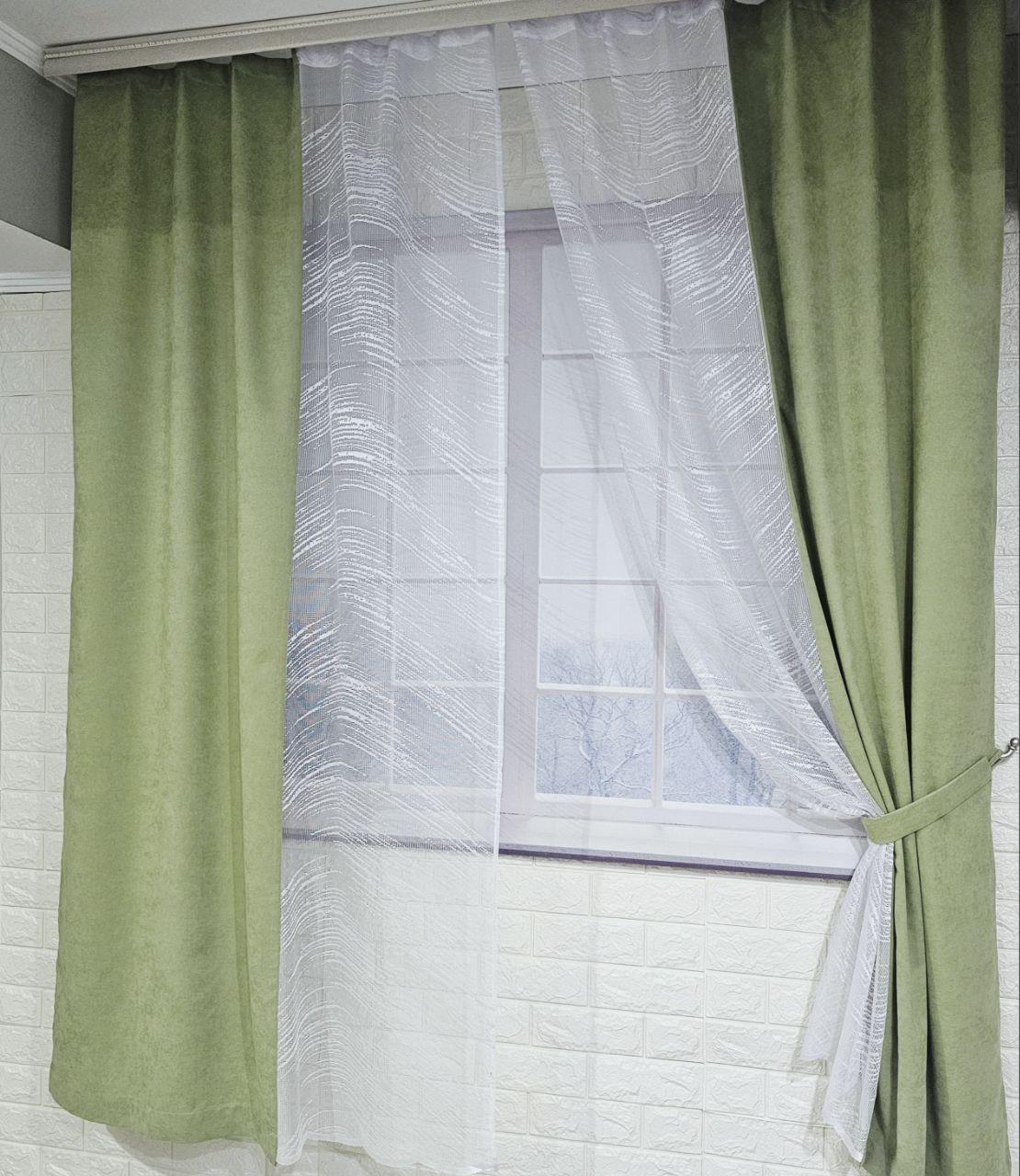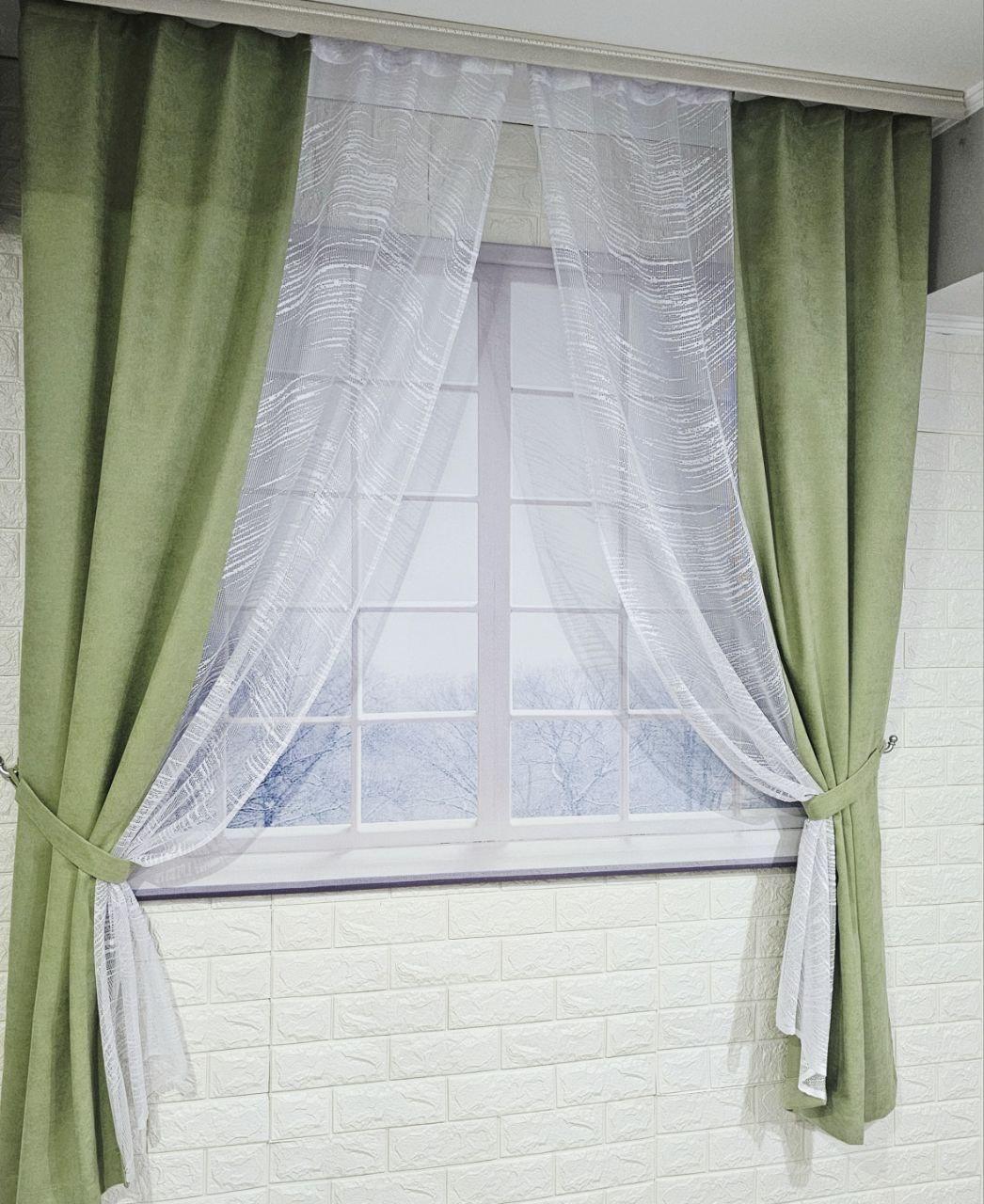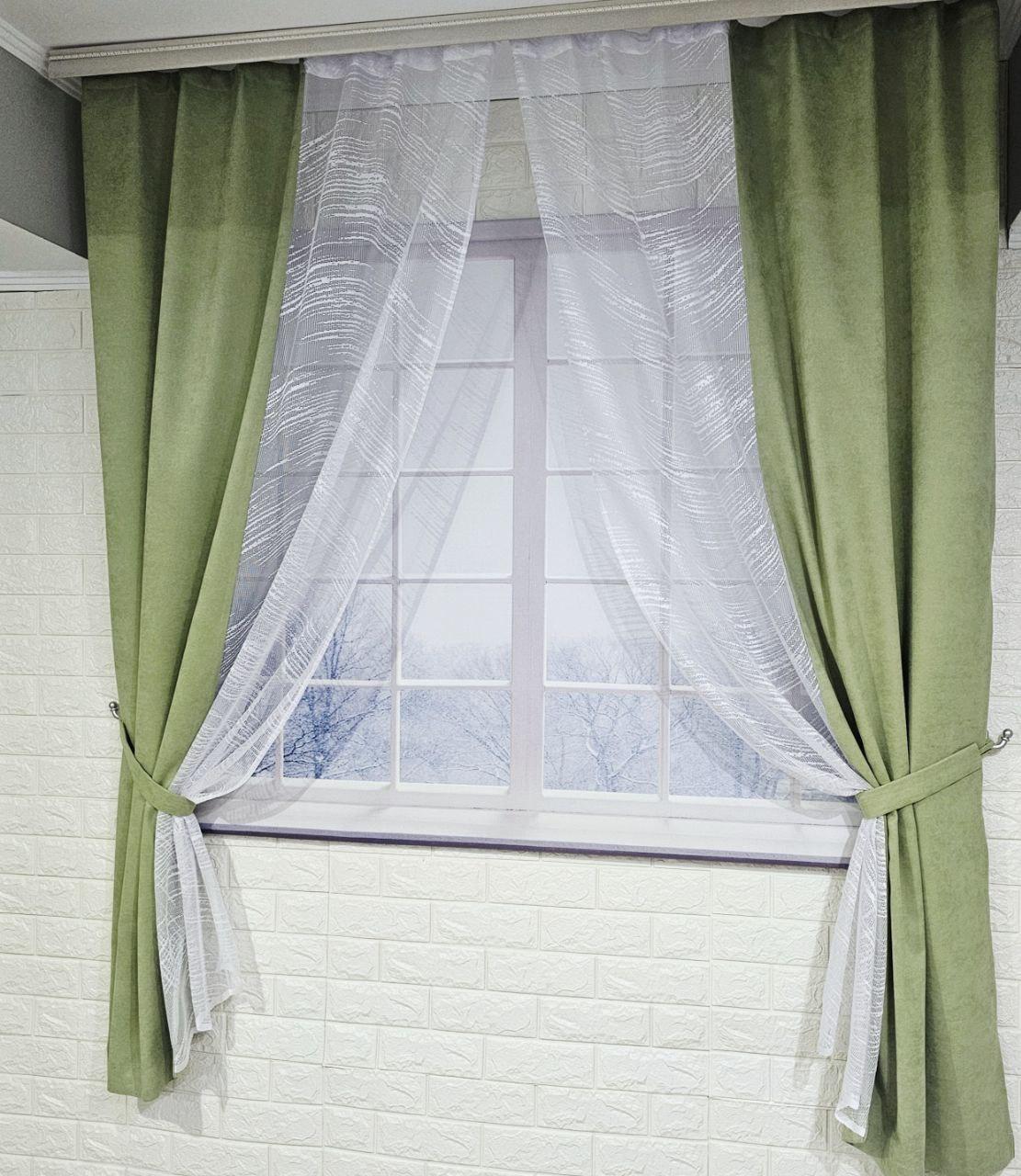 Комплект короткие шторы тюль. Цвет фисташковый с белым