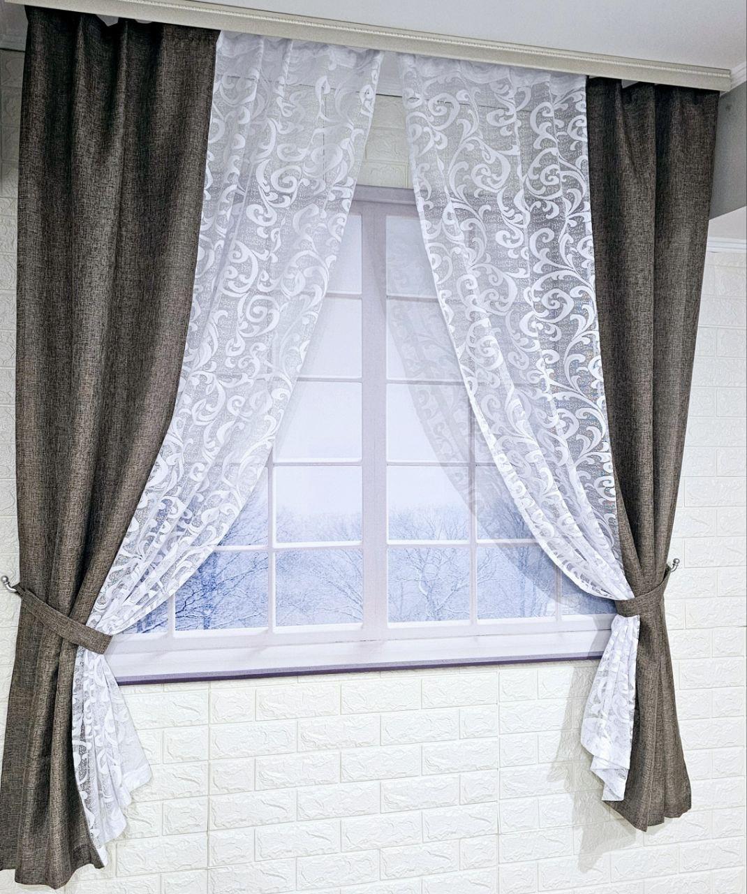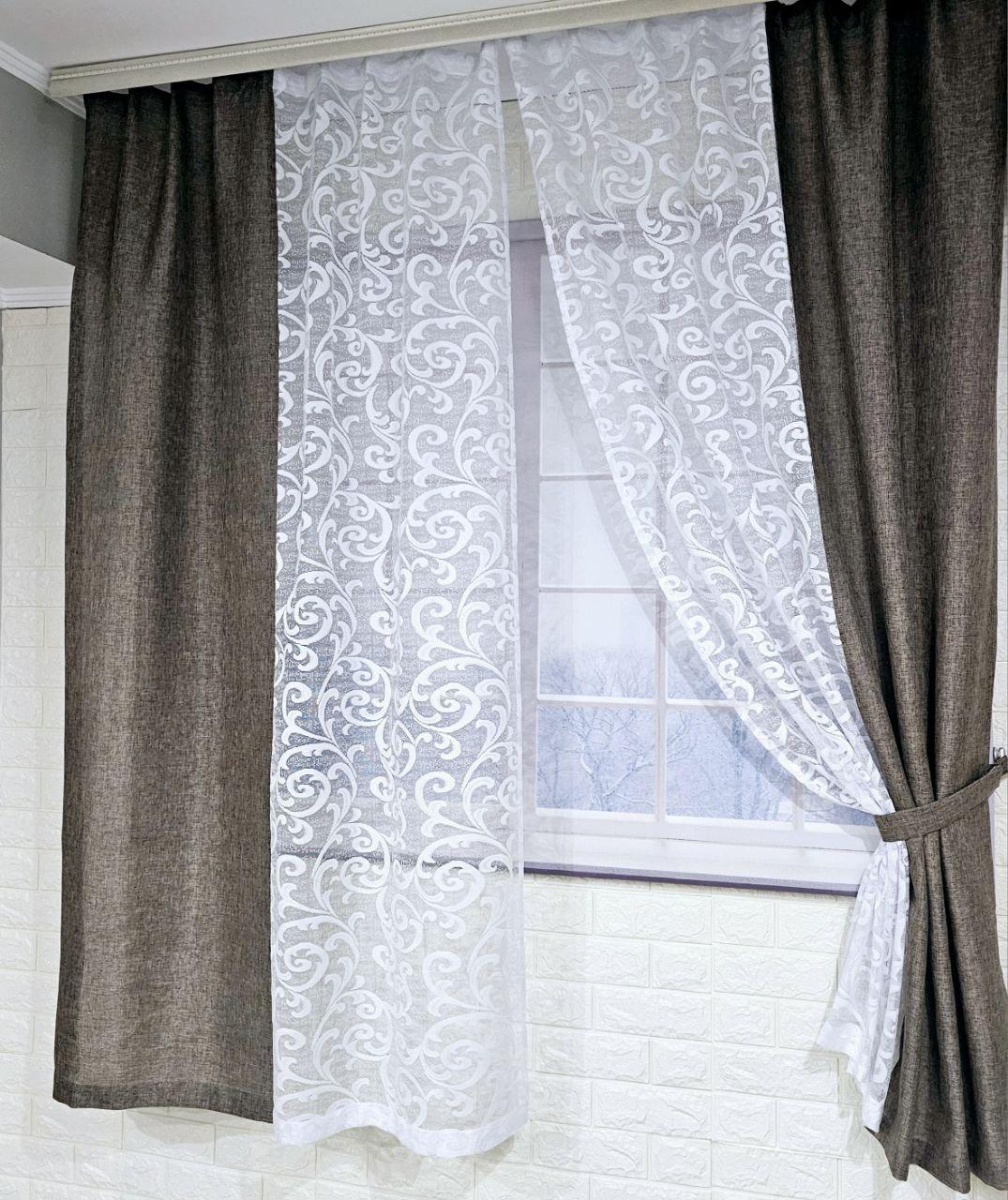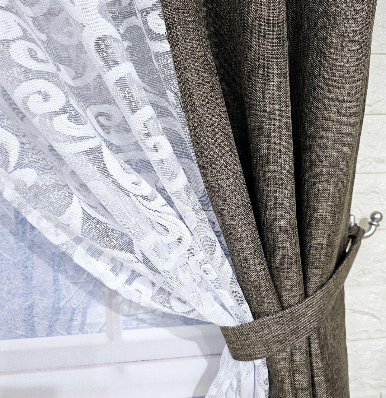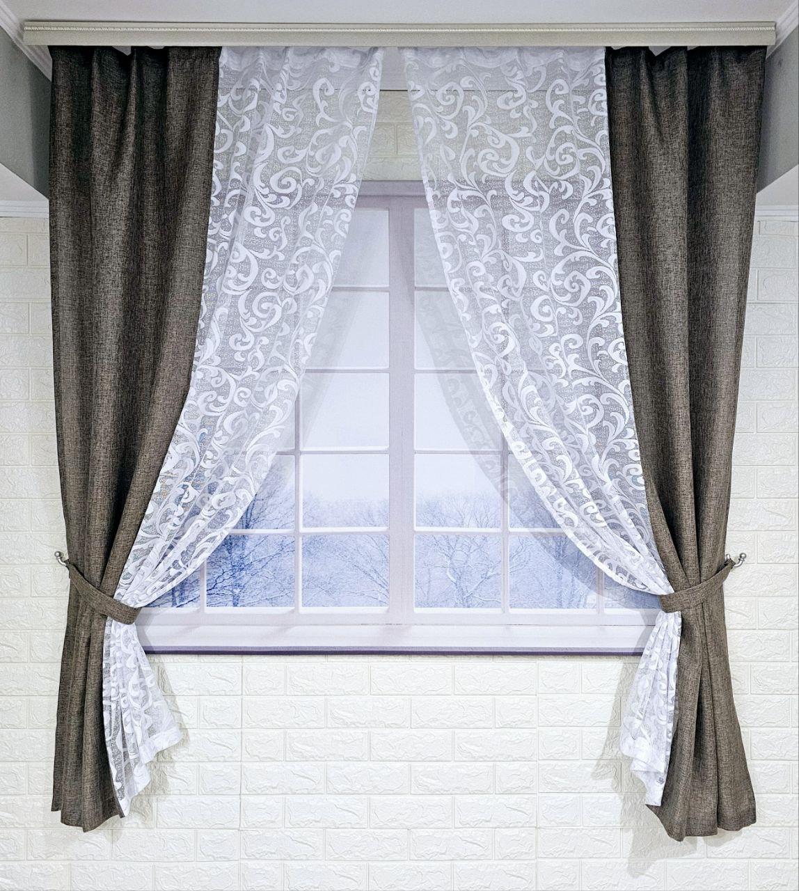 Комплект короткие шторы тюль. Цвет какао с белым