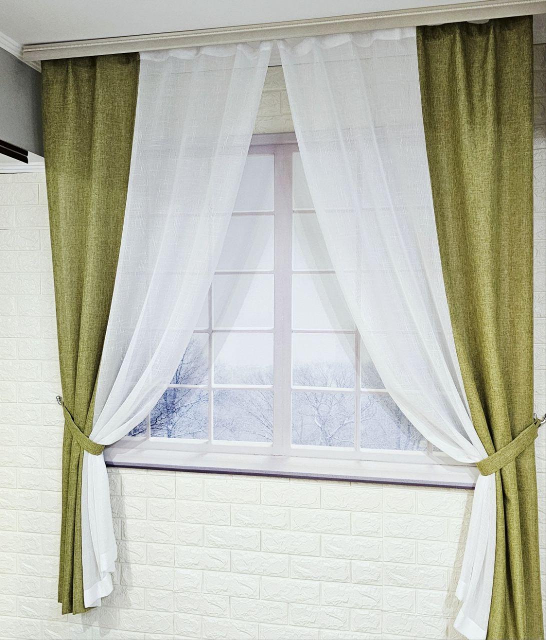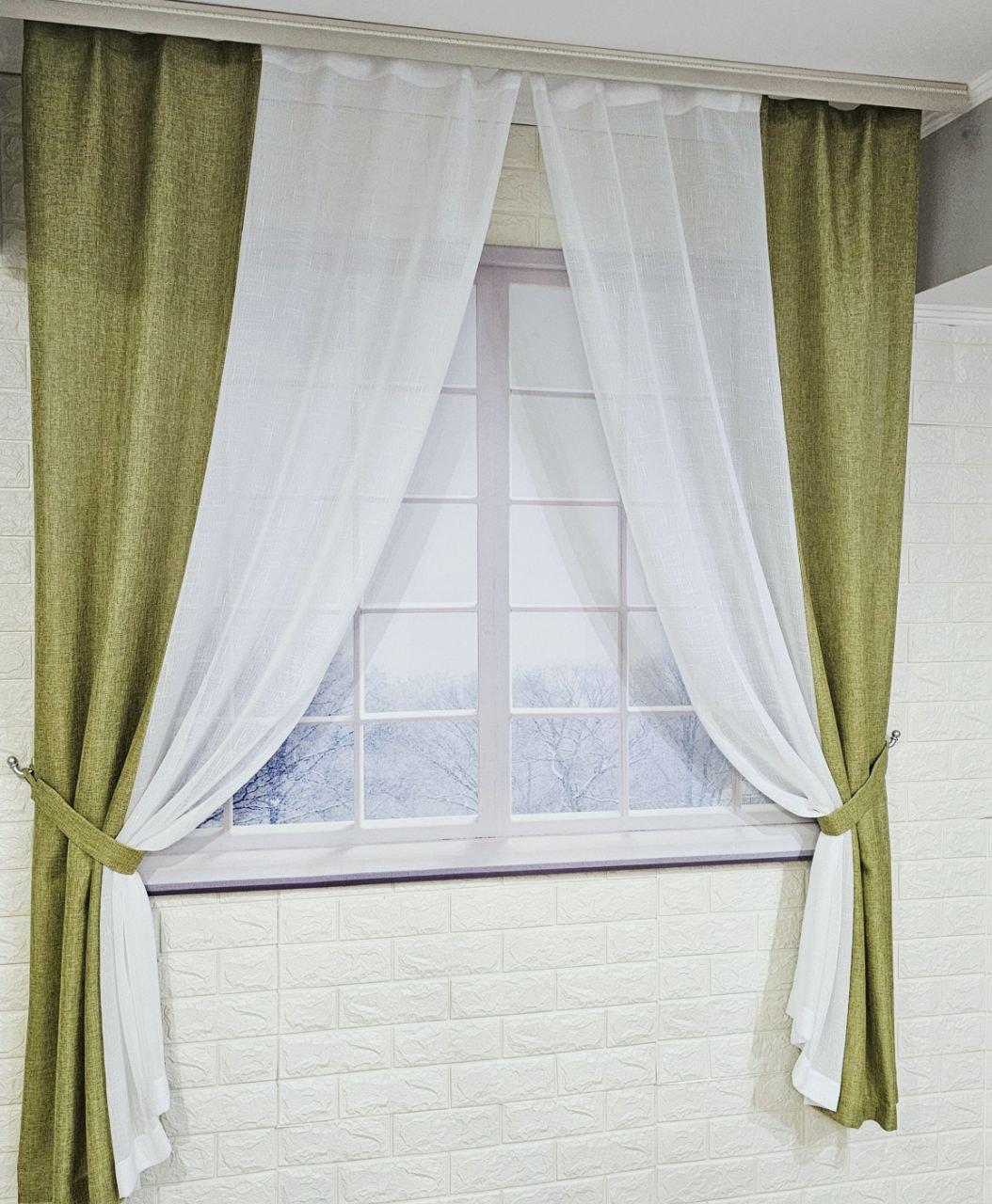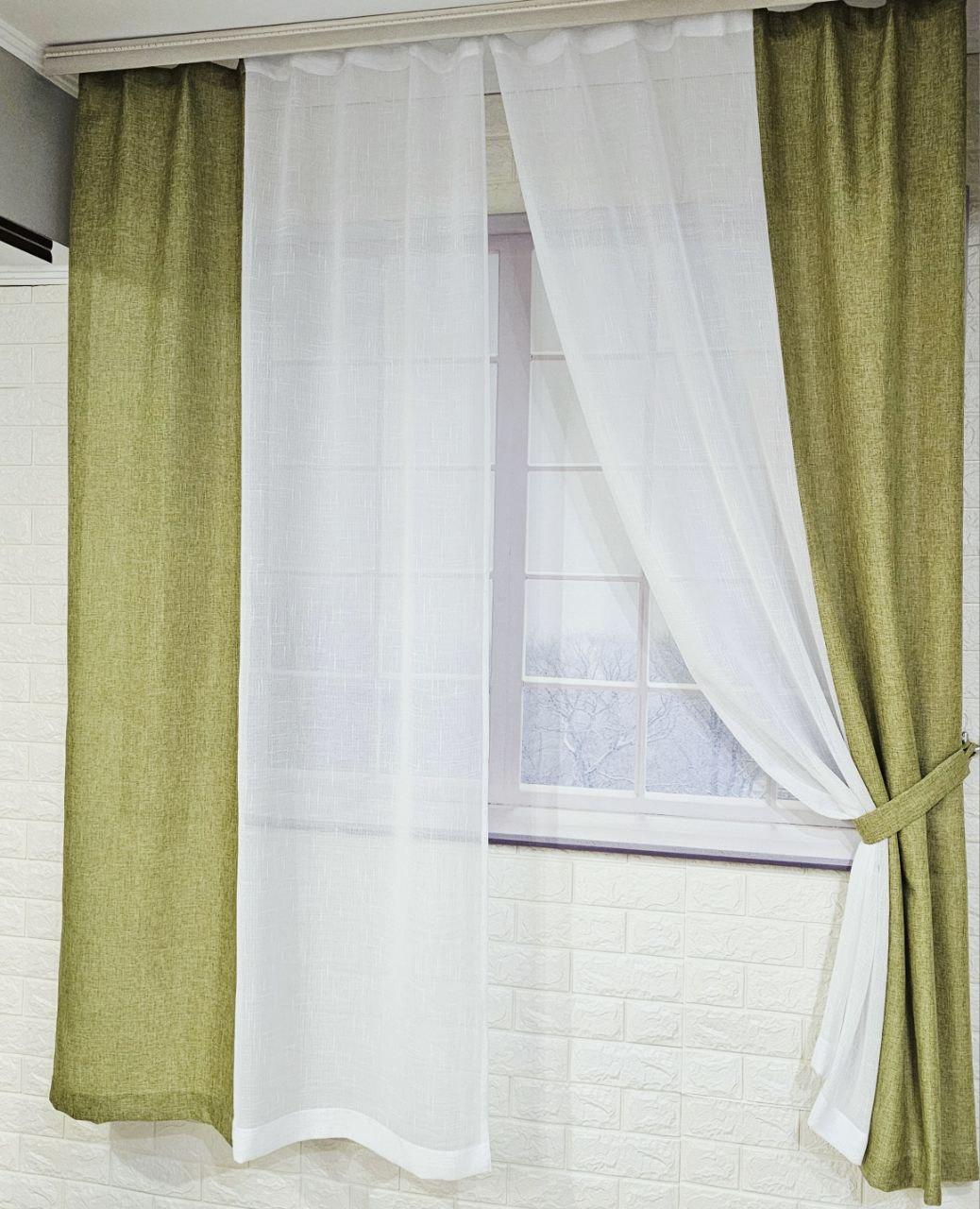 Комплект короткие шторы тюль. Цвет оливковый с белым