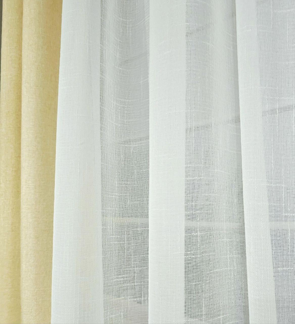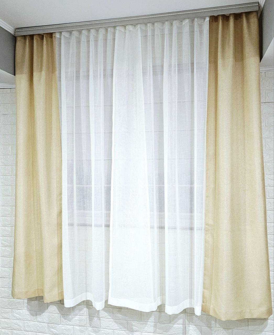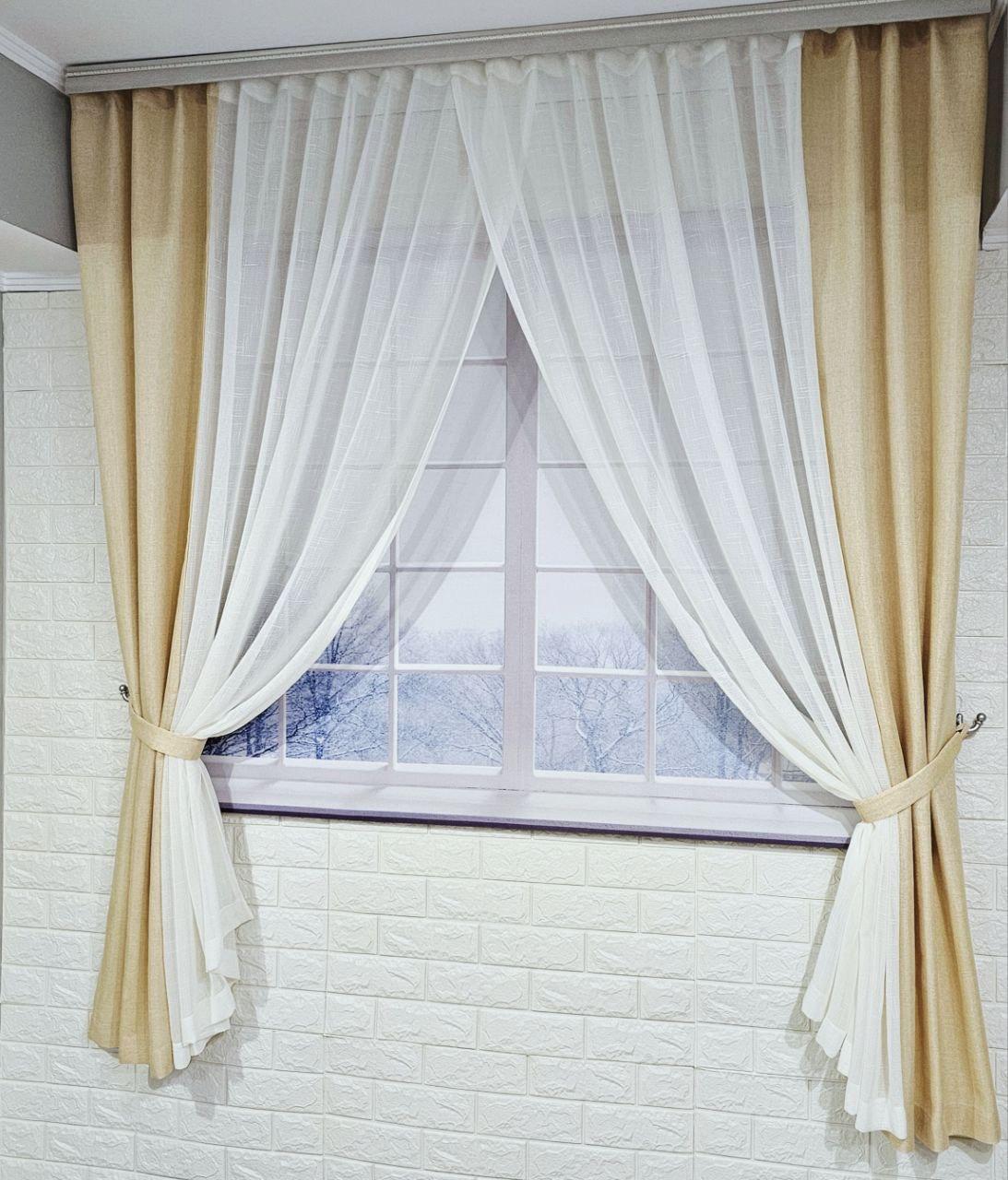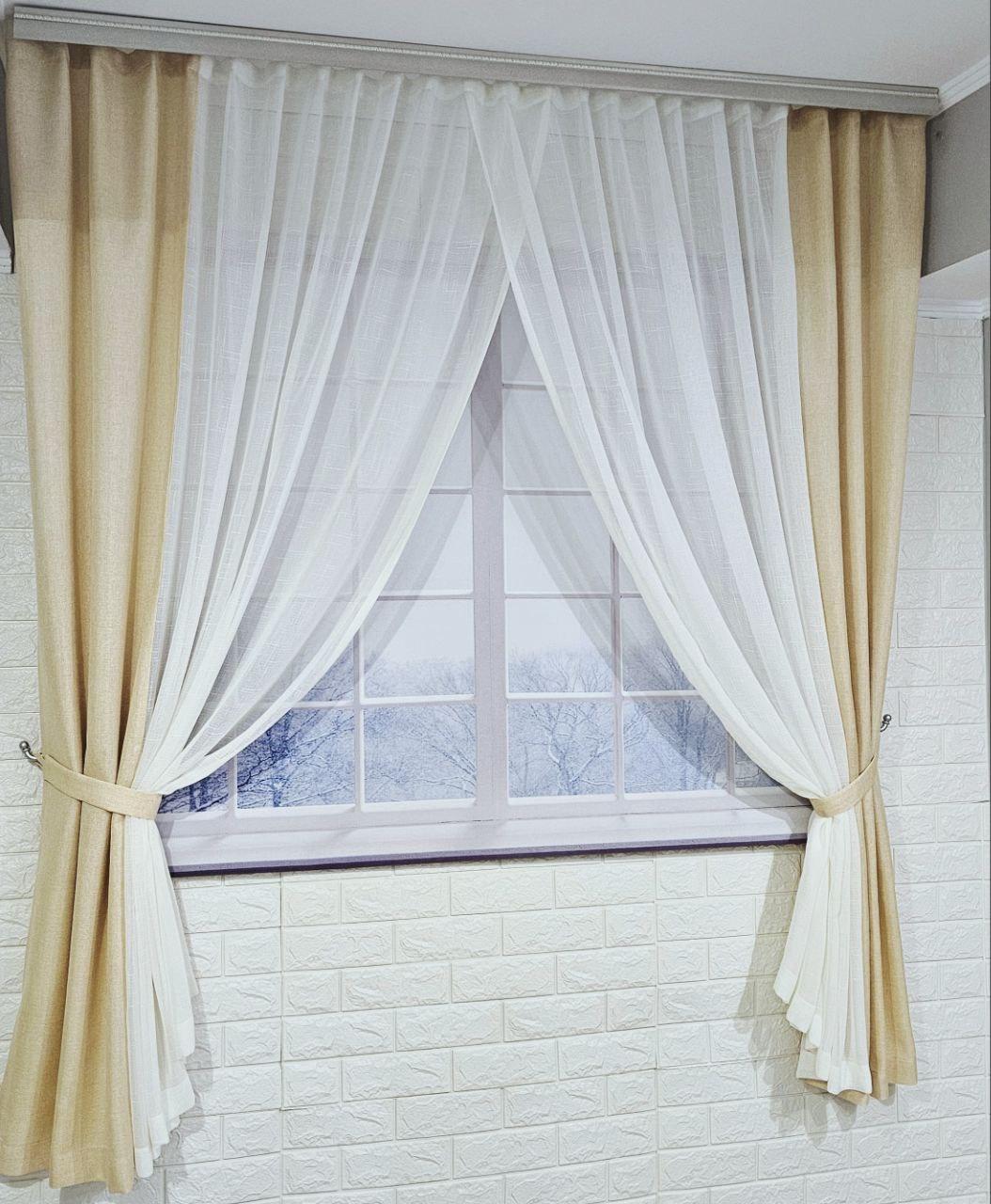 Комплект короткие шторы тюль. Цвет соломенный с молочным