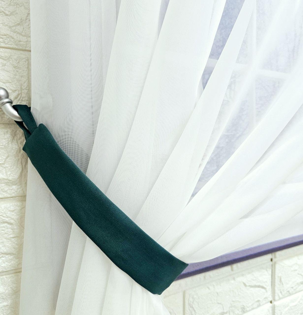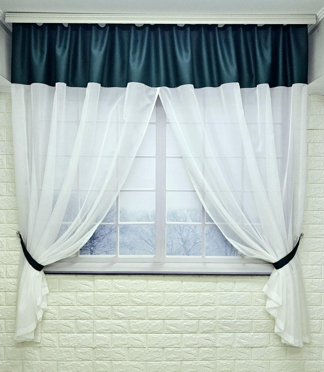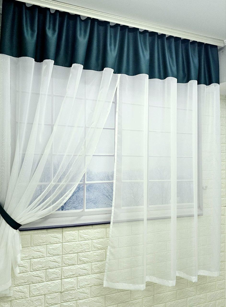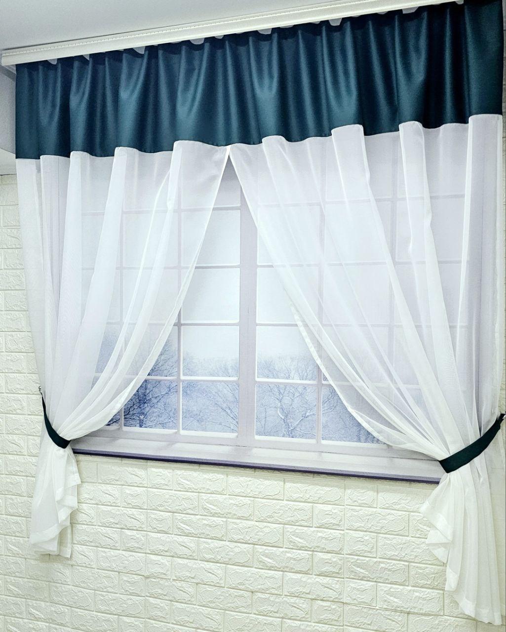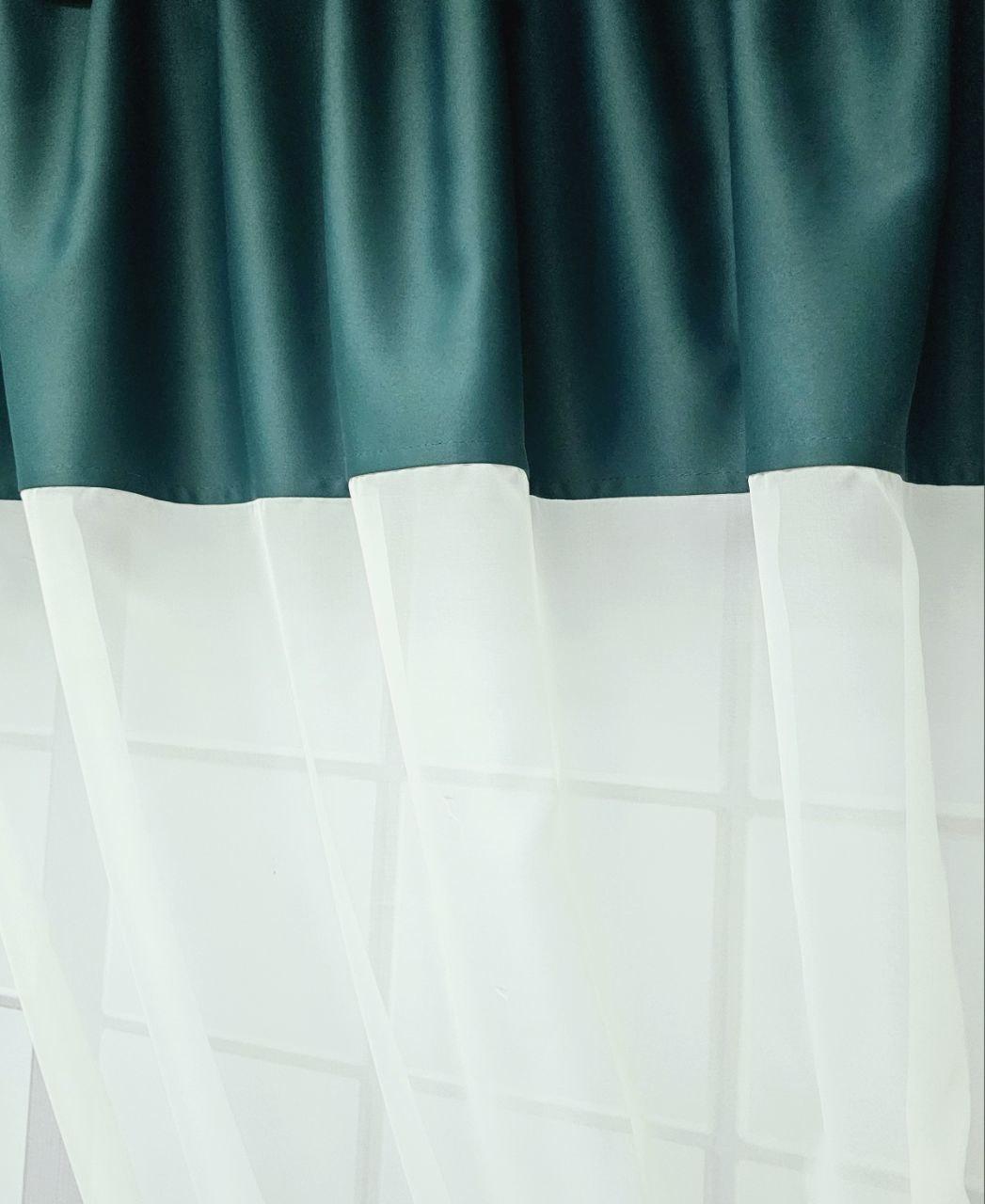 Комплект короткие шторы тюль на кухню. Цвет зеленый с молочным