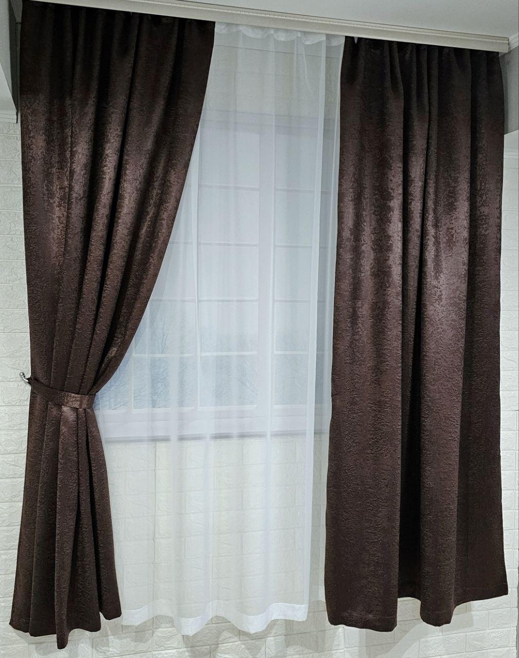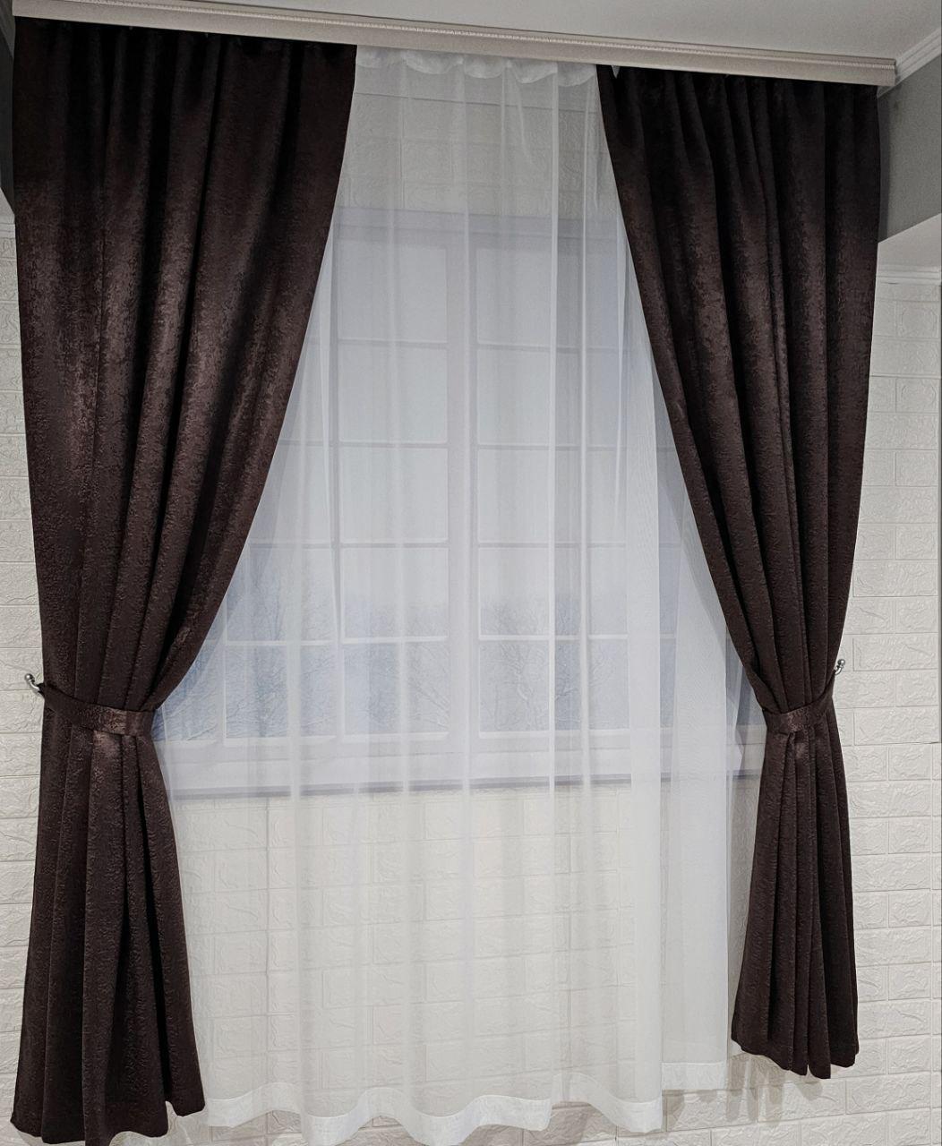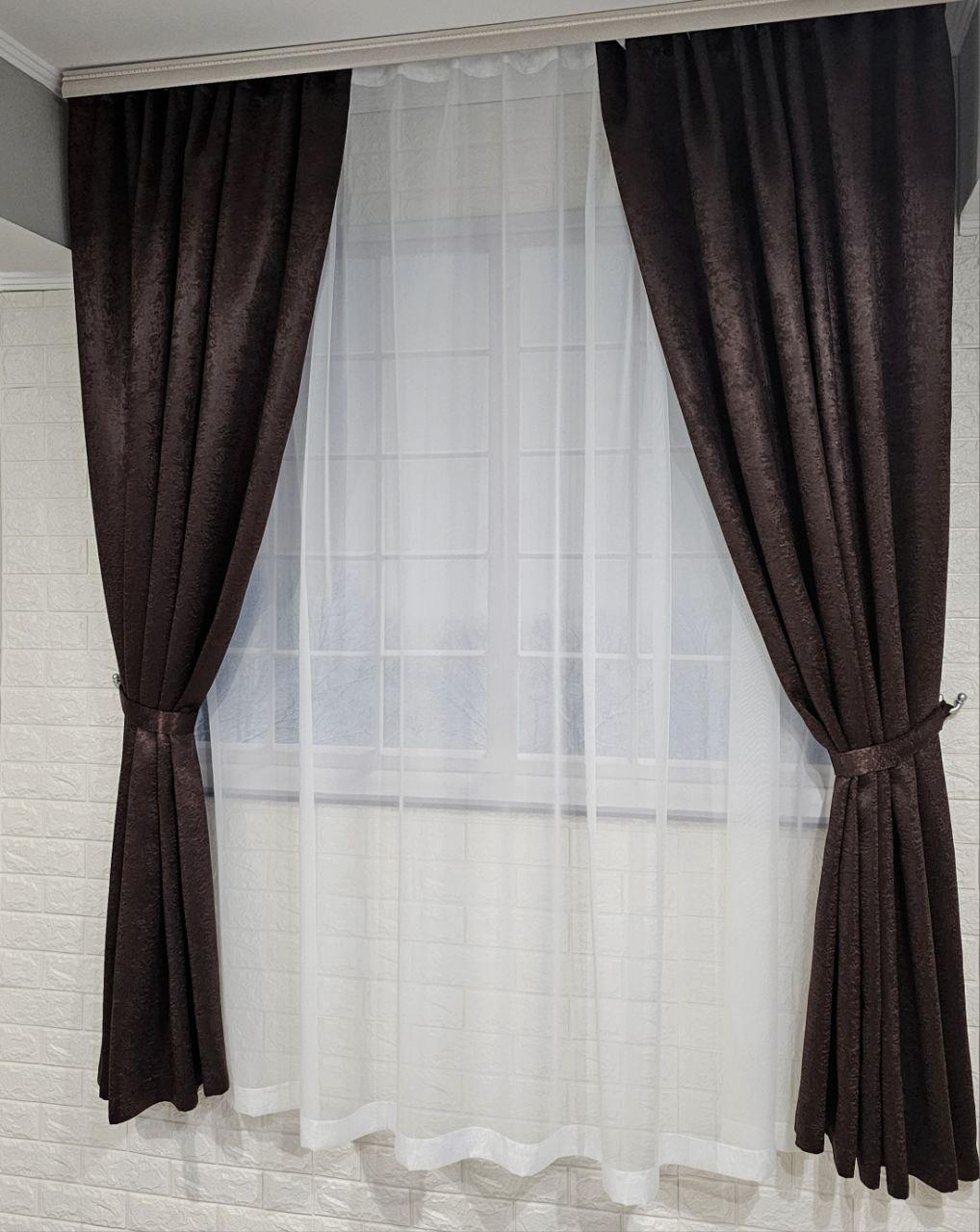 Комплект короткие шторы и тюль. Блэкаут софт + тюль шифон вуаль. Цвет: венге шторы, белый тюль