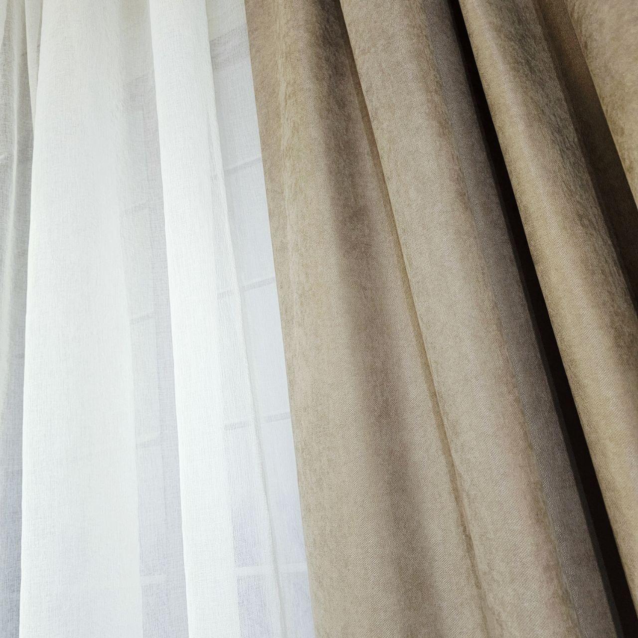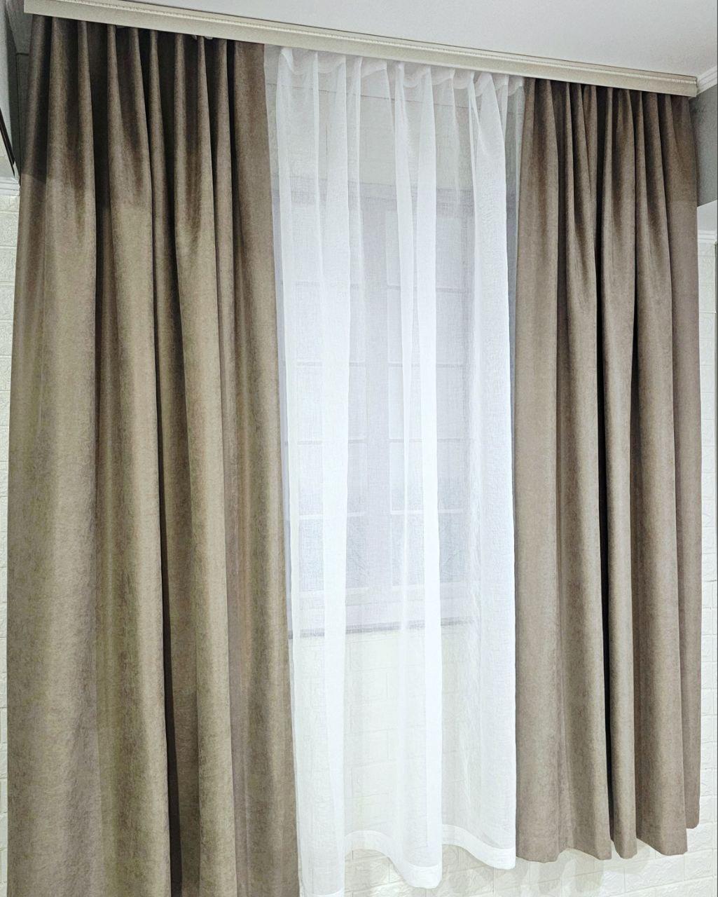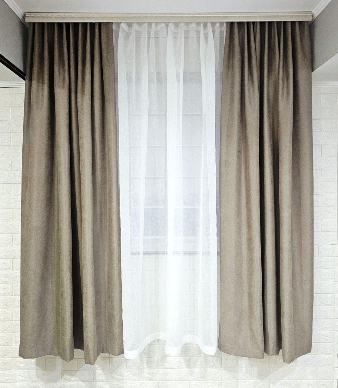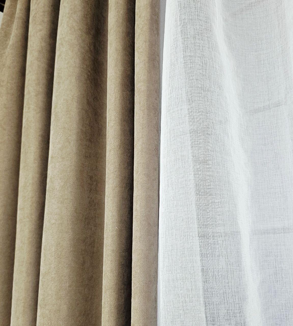 Комплект короткие шторы и тюль. Микровелюр + тюль шифон. Цвет: темный бежевый шторы, белый тюль