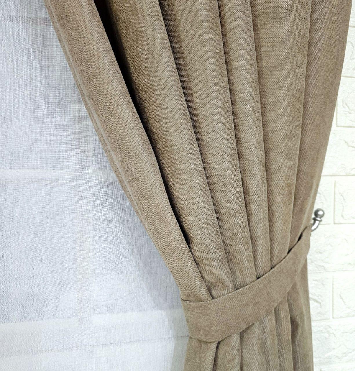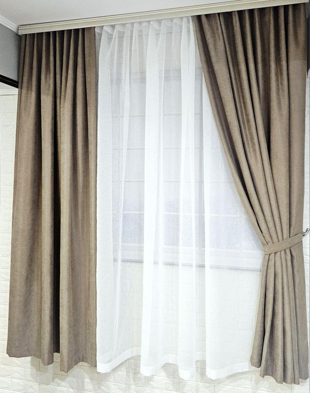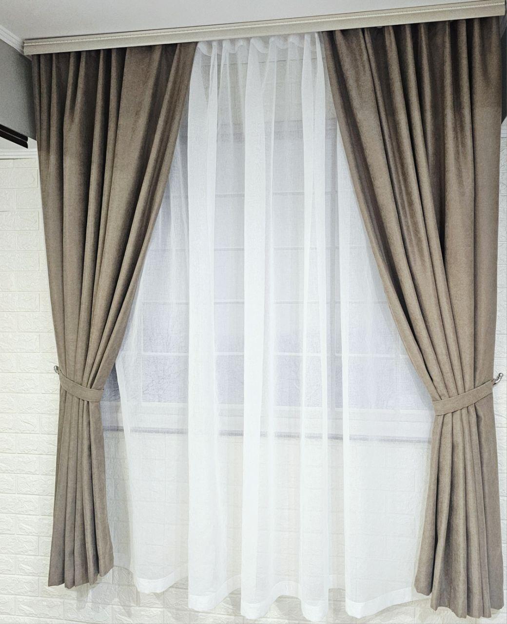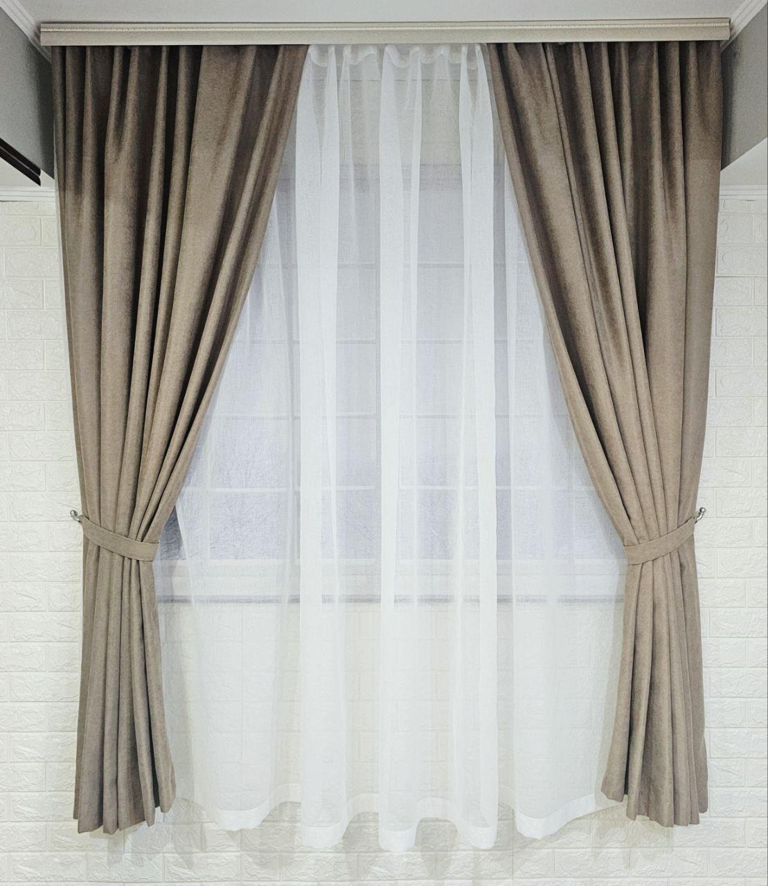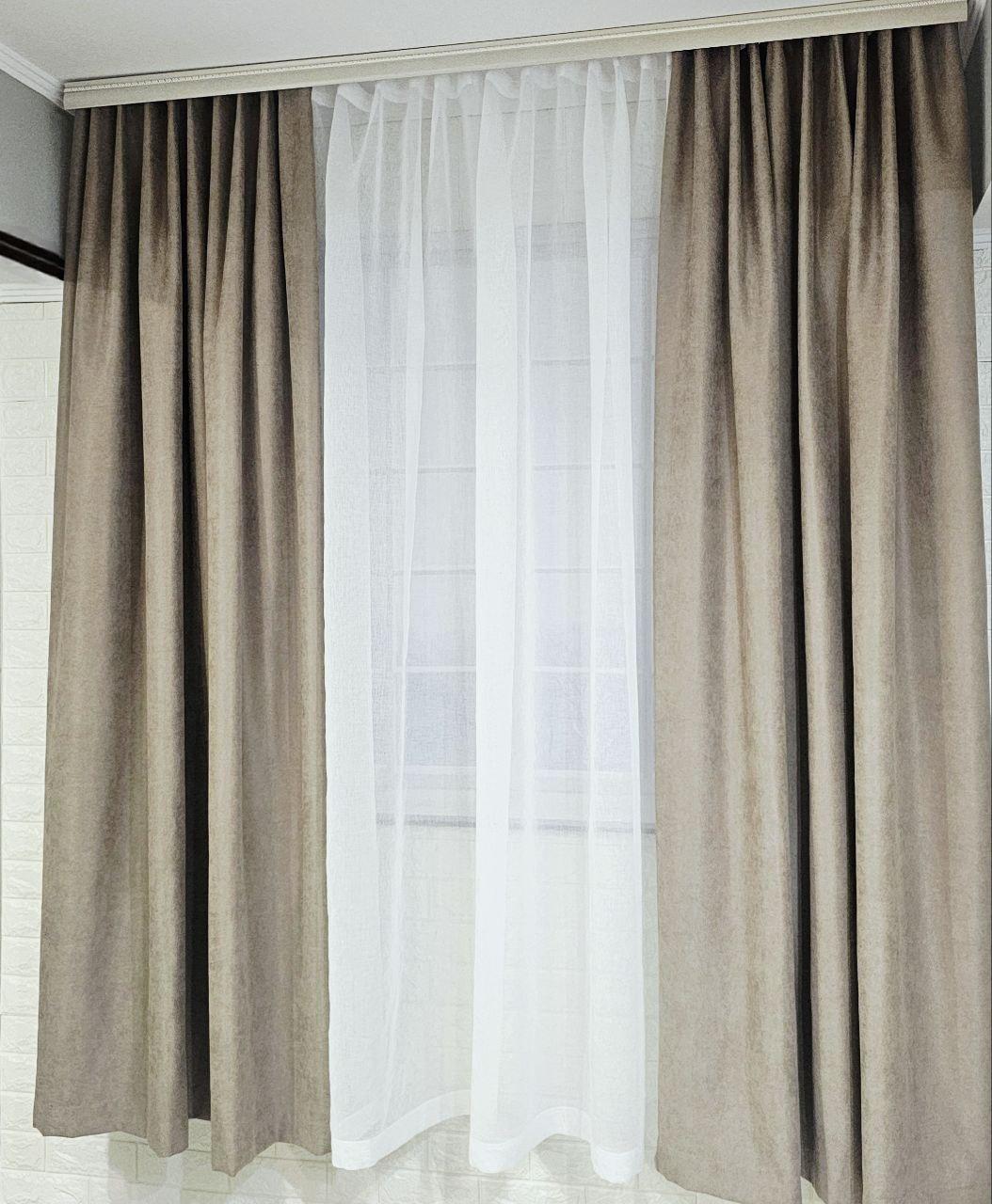 Комплект короткие шторы и тюль. Микровелюр + тюль шифон. Цвет: темный бежевый шторы, белый тюль