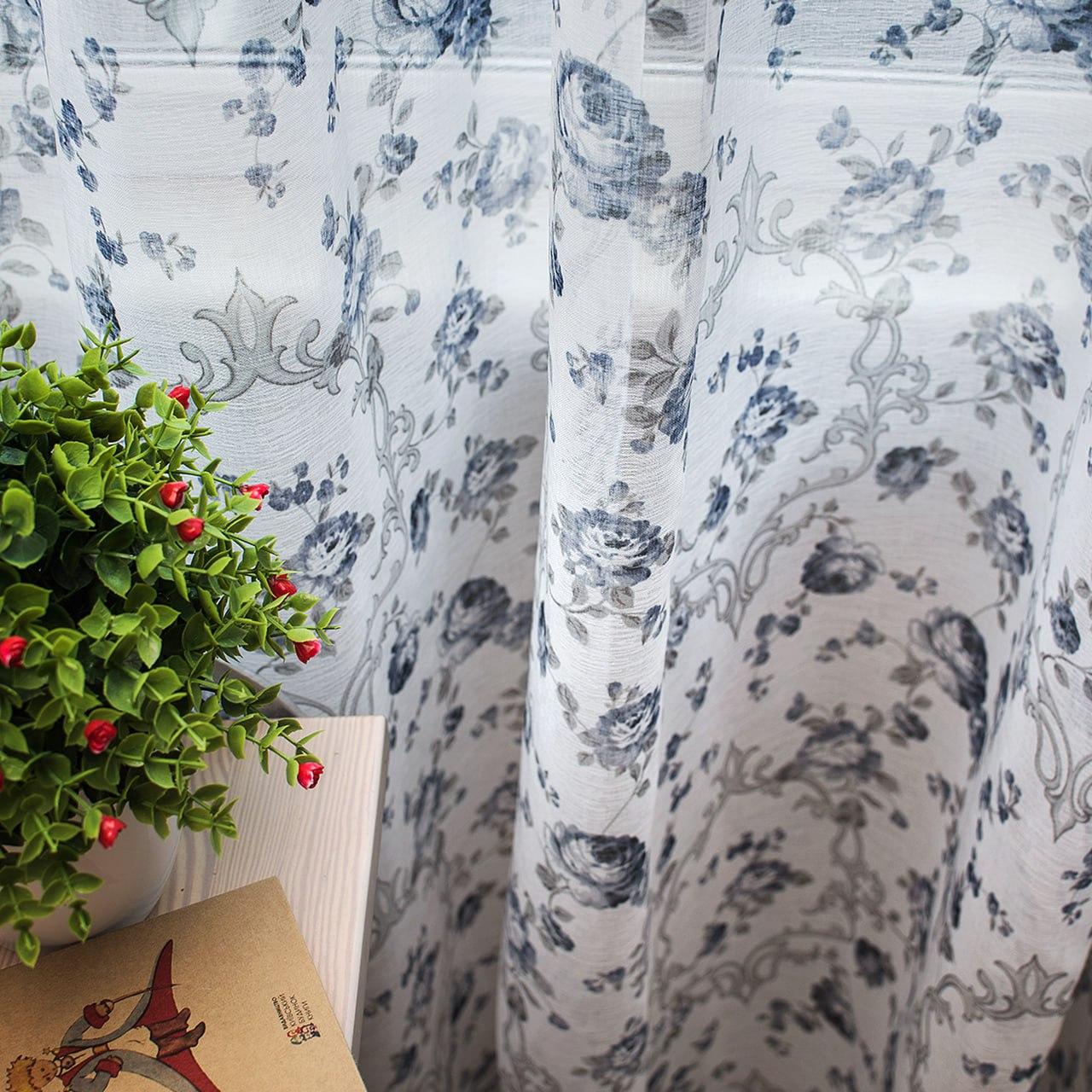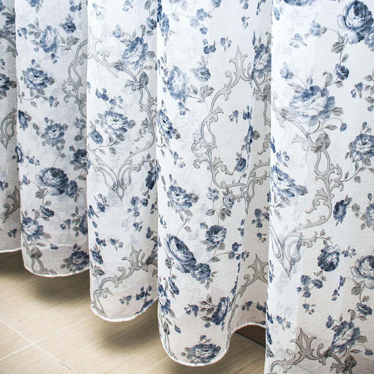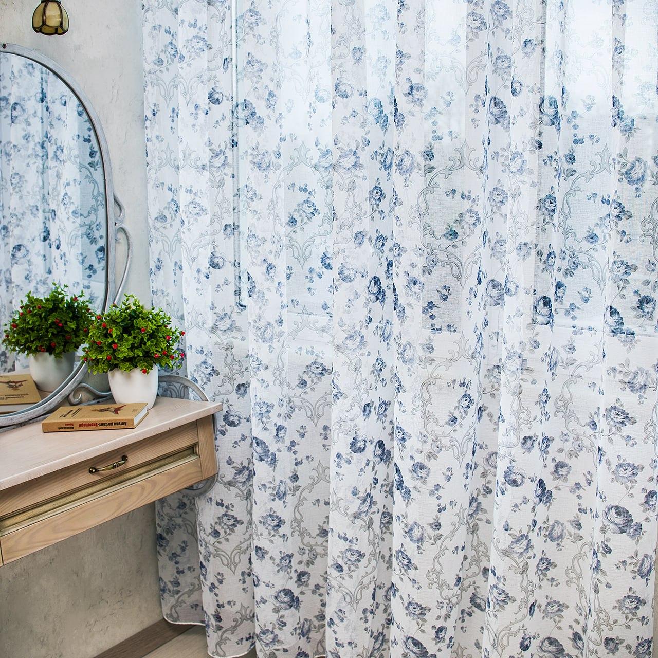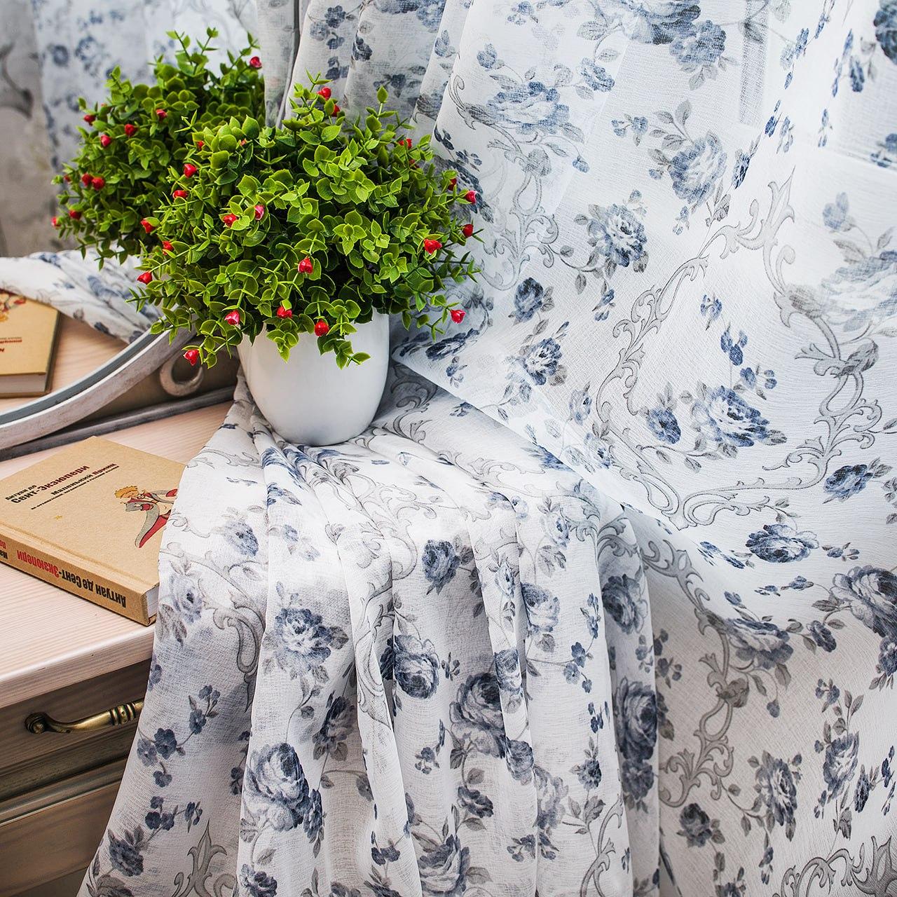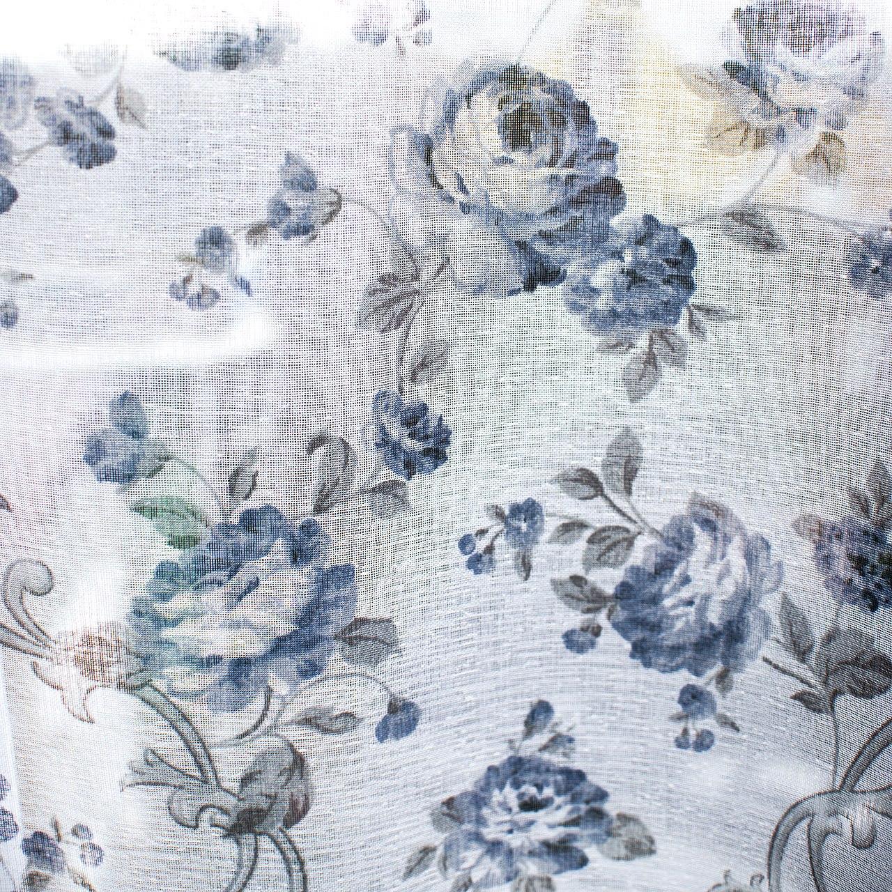 Тюль лен Прованс, с утяжелителем. Цветочный принт, цвет белый с синим