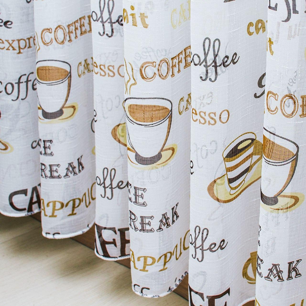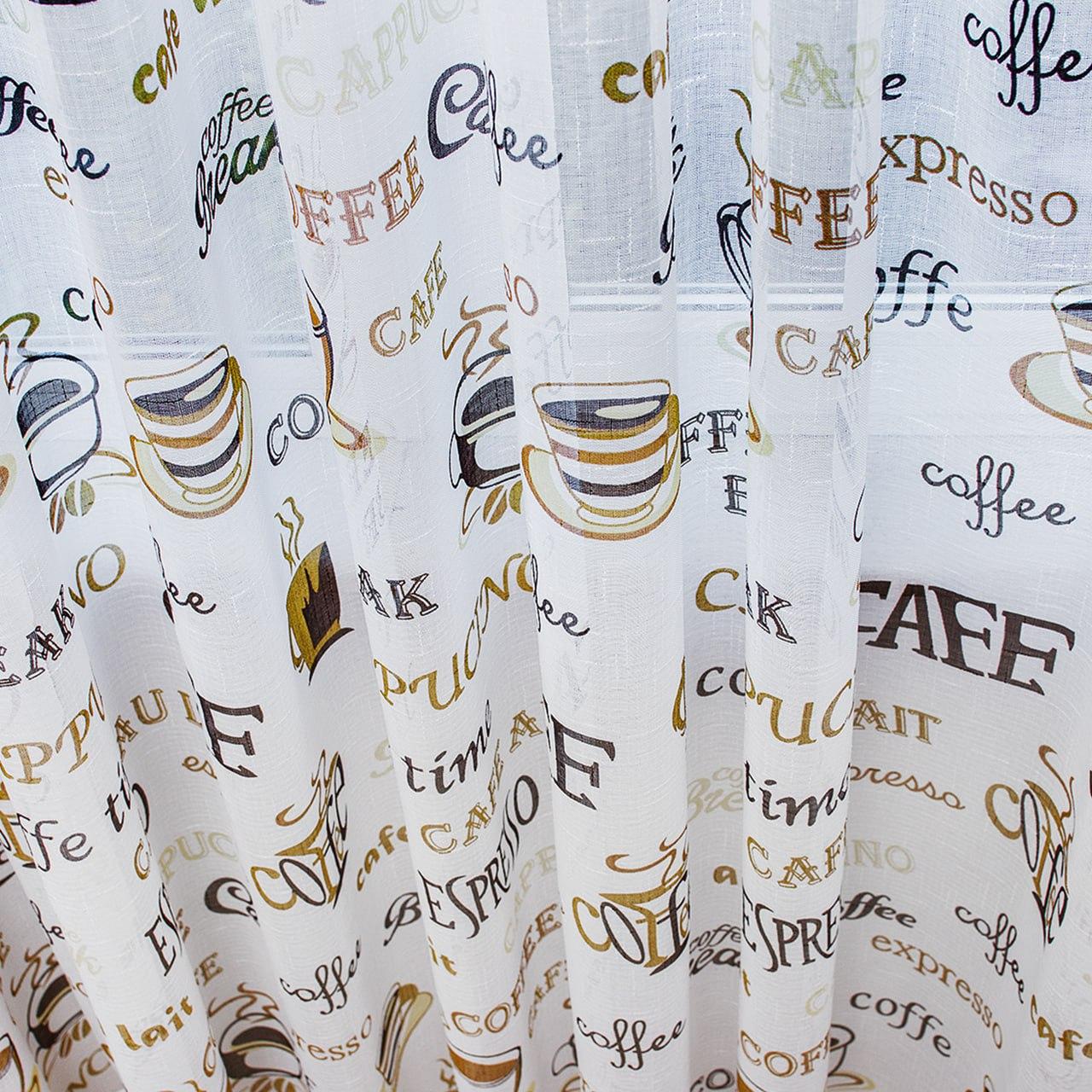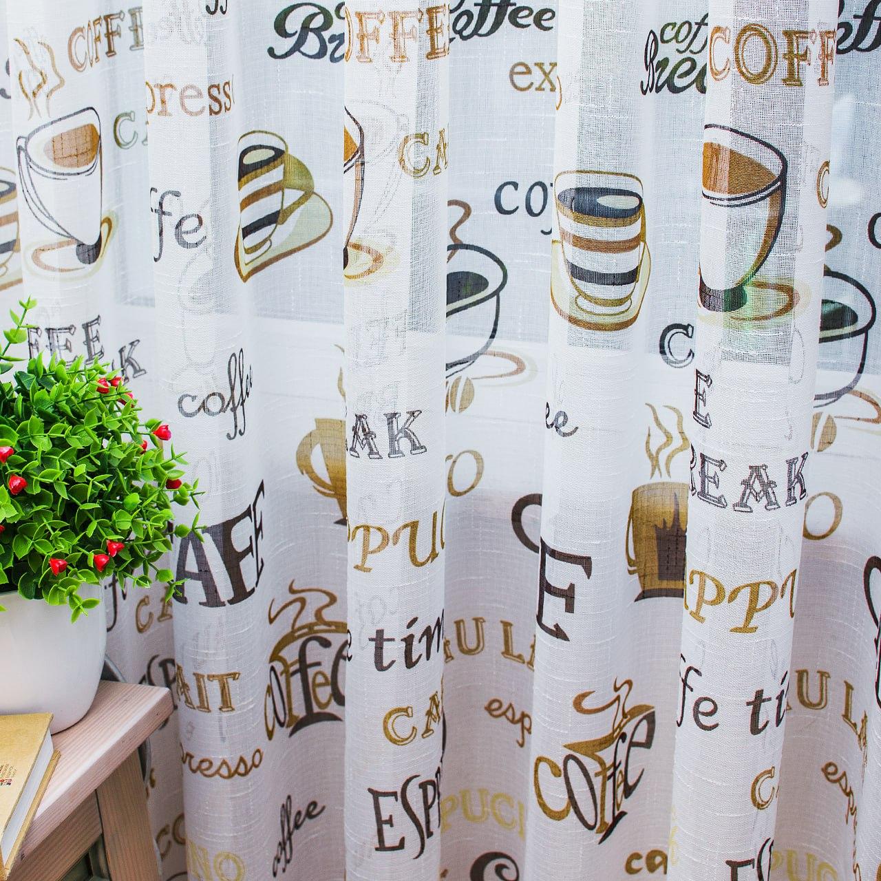 Тюль лен с принтом Кофе. Цвет белый с бежевым и коричневым