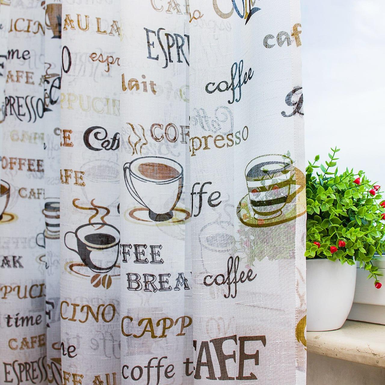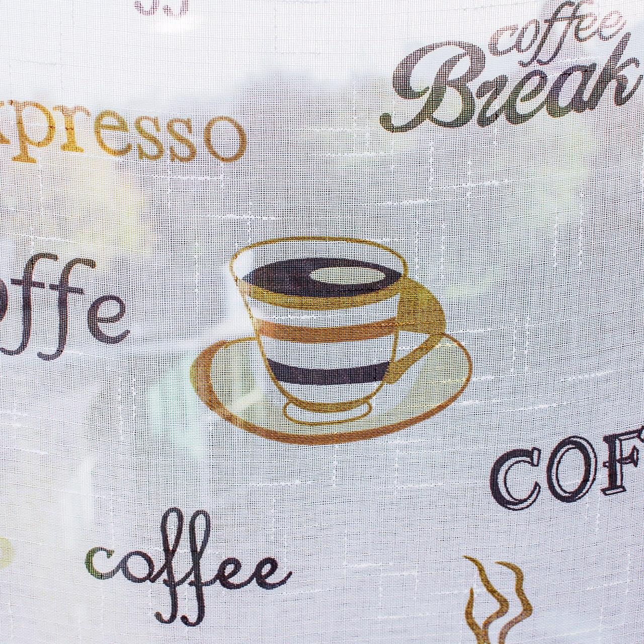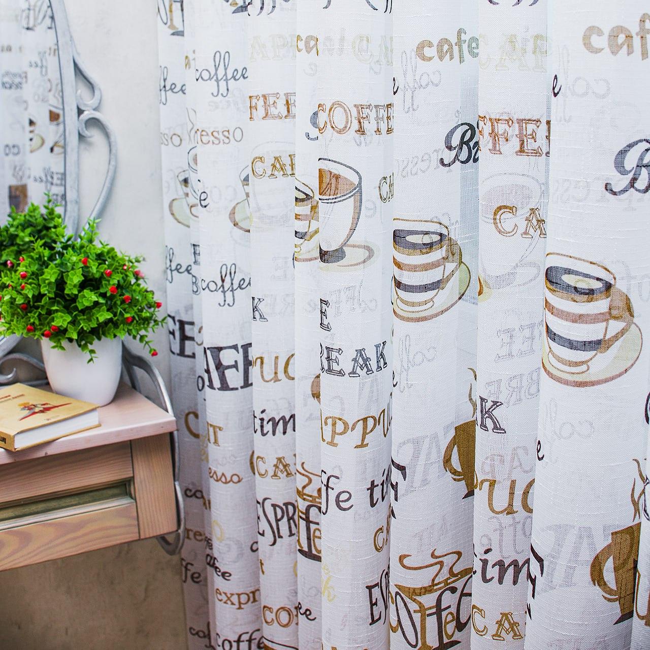 Тюль лен с принтом Кофе. Цвет белый с бежевым и коричневым